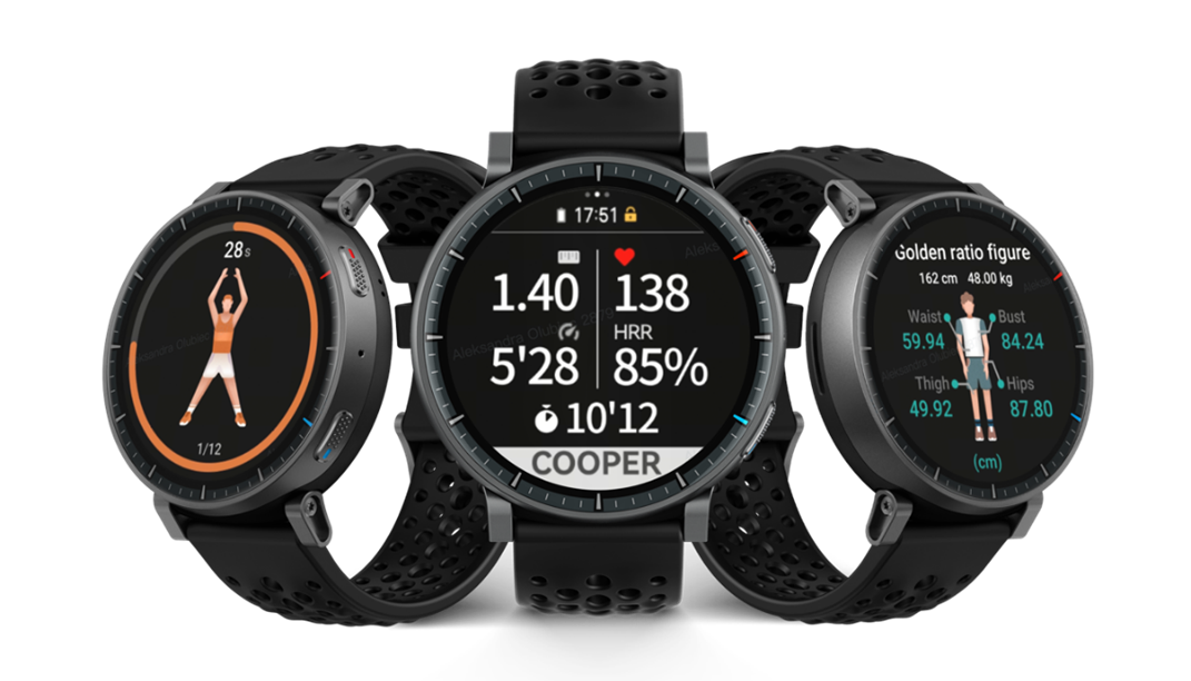 - App di valutazione fitness: Cooper VO₂Max Test, che durante una corsa di 12 minuti mostra parametri come distanza, ritmo e deriva della frequenza cardiaca, fornendo al termine una stima del consumo massimo di ossigeno.
