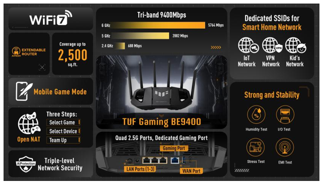 ASUS ha annunciato oggi il TUF Gaming BE9400, un router WiFi 7 ad alte prestazioni progettato per fornire una velocità di trasmissione tri-band fino a 9400 Mbps con una stabilità eccezionale. Questo router è dotato di tre porte LAN 2,5G e una porta WAN 2,5G, canali ultra-ampi a 320 MHz, 4096-QAM e Multi-Link Operation (MLO) per migliorare la velocità e l’efficienza su una copertura di 230 metri quadrati. È inoltre dotato di accelerazione di gioco con una porta dedicata, modalità Mobile Game e OpenNAT per un gameplay ottimizzato. Altre caratteristiche includono sottoreti Smart Home Master, sicurezza basata su AiProtection, opzioni VPN preinstallate e AiMesh potenziato con WiFi 7. Il BE9400 è progettato per fornire una connettività stabile, sicura ed estendibile ed è costruito secondo gli standard TUF per garantire affidabilità e durata a lungo termine.
