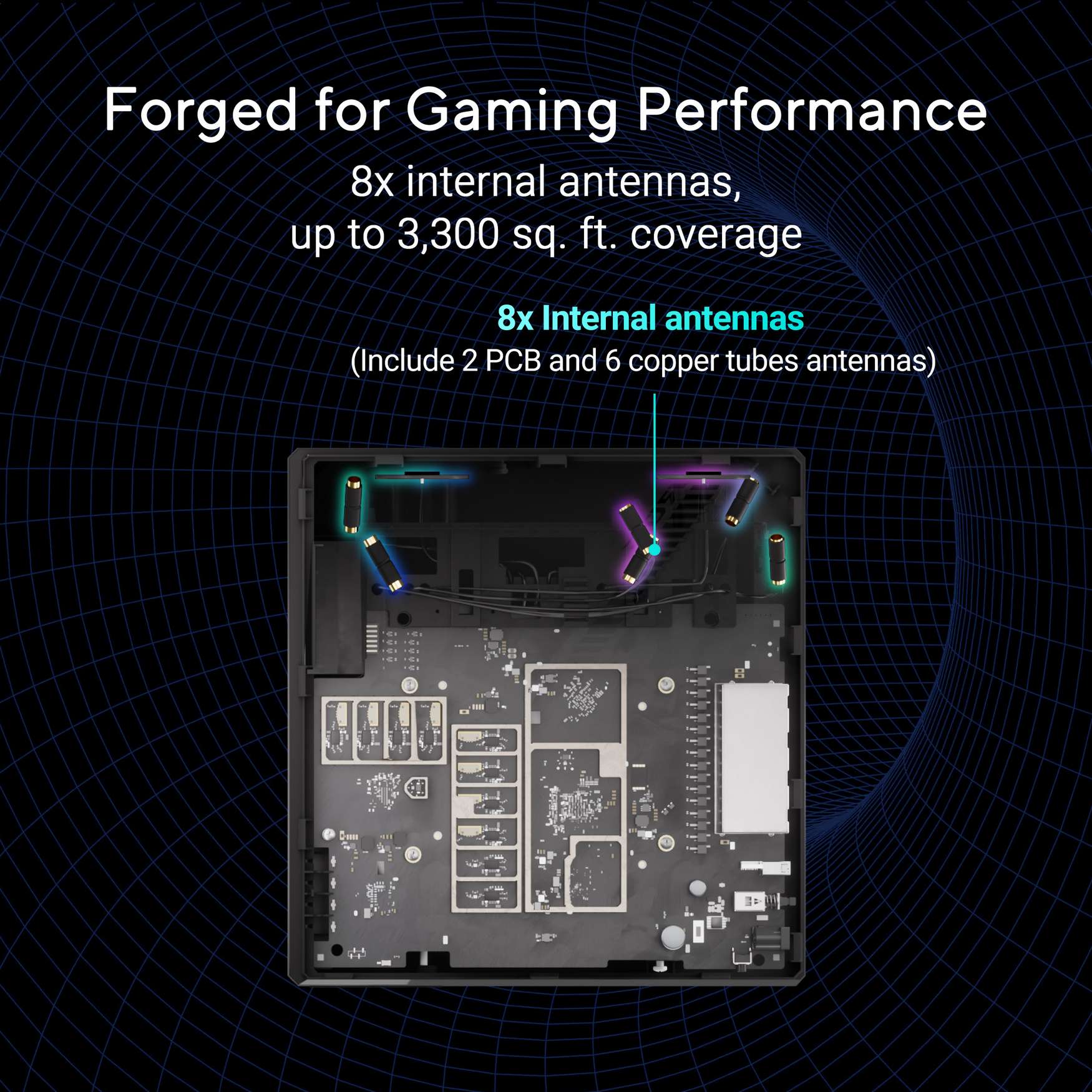 Il ROG Strix GS-BE18000 è stato progettato con cura per garantire prestazioni di rete senza compromessi. È dotato di una CPU quad-core da 2,0GHz ad alte prestazioni con un sistema di raffreddamento migliorato che ne garantisce un funzionamento senza rallentamenti anche nelle situazioni più congestionate. Questo concentrato di potenza compatto vanta otto antenne interne con amplificatore dedicato ed è alimentato da moduli front-end indipendenti (FEM) che coprono fino a 280 metri quadrati, eliminando le zone morte e contribuendo a garantire un’esperienza di gioco senza interruzioni in tutta la casa.