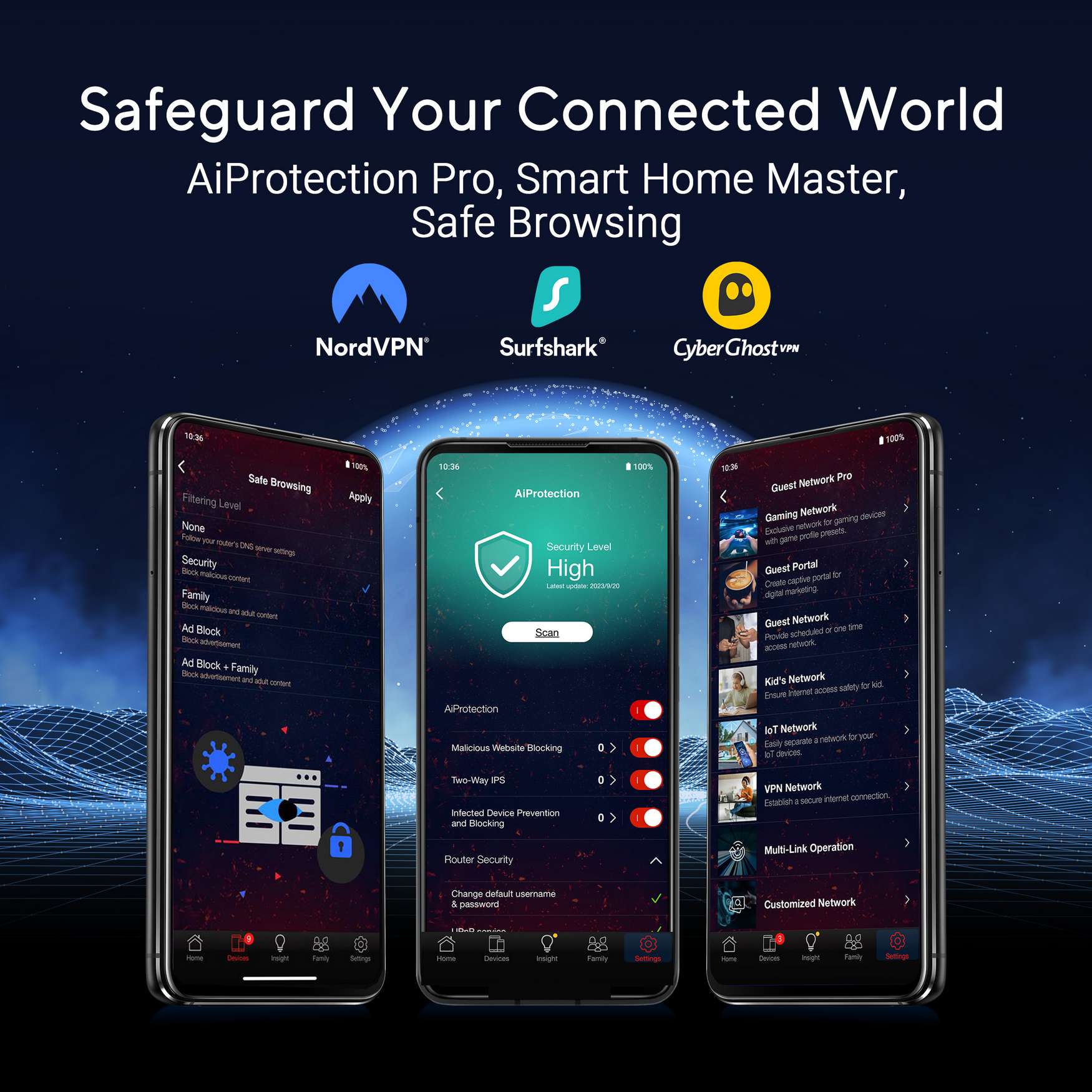 Il ROG Strix GS-BE18000 va oltre il concetto di un tradizionale router gaming: semplifica anche la gestione dell’intera rete di dispositivi IoT e Smart presenti nelle case più moderne, organizzandone la gestione attraverso l’intuitiva app mobile “ASUS Router” oppure direttamente tramite l’apposita interfaccia web. L’esclusiva tecnologia Smart Home Master di ASUS offre l’opportunità di sfruttare connessioni istantanee tramite SSID personalizzati, garantendo una migliore compatibilità WiFi 7, una gestione efficiente della rete ed una maggiore protezione dei dispositivi IoT di casa oppure di una sottorete dedicata ai bambini. La rete MLO consente agli utenti di connettere senza problemi i dispositivi che supportano lo standard MLO ad un SSID dedicato, semplificando la configurazione e la gestione. Questa innovativa sottorete garantisce la compatibilità, riduce al minimo le interferenze e migliora le prestazioni dell’intera rete. Inoltre, ROG Strix GS-BE18000 offre una sicurezza di rete a triplo livello con AiProtection Pro, scansione di sicurezza con un solo tocco e navigazione sicura, contribuendo a proteggere tutti i dispositivi collegati all’infrastruttura di rete dalle minacce online, oltre che a fornire una pratica e sicura funzionalità VPN.