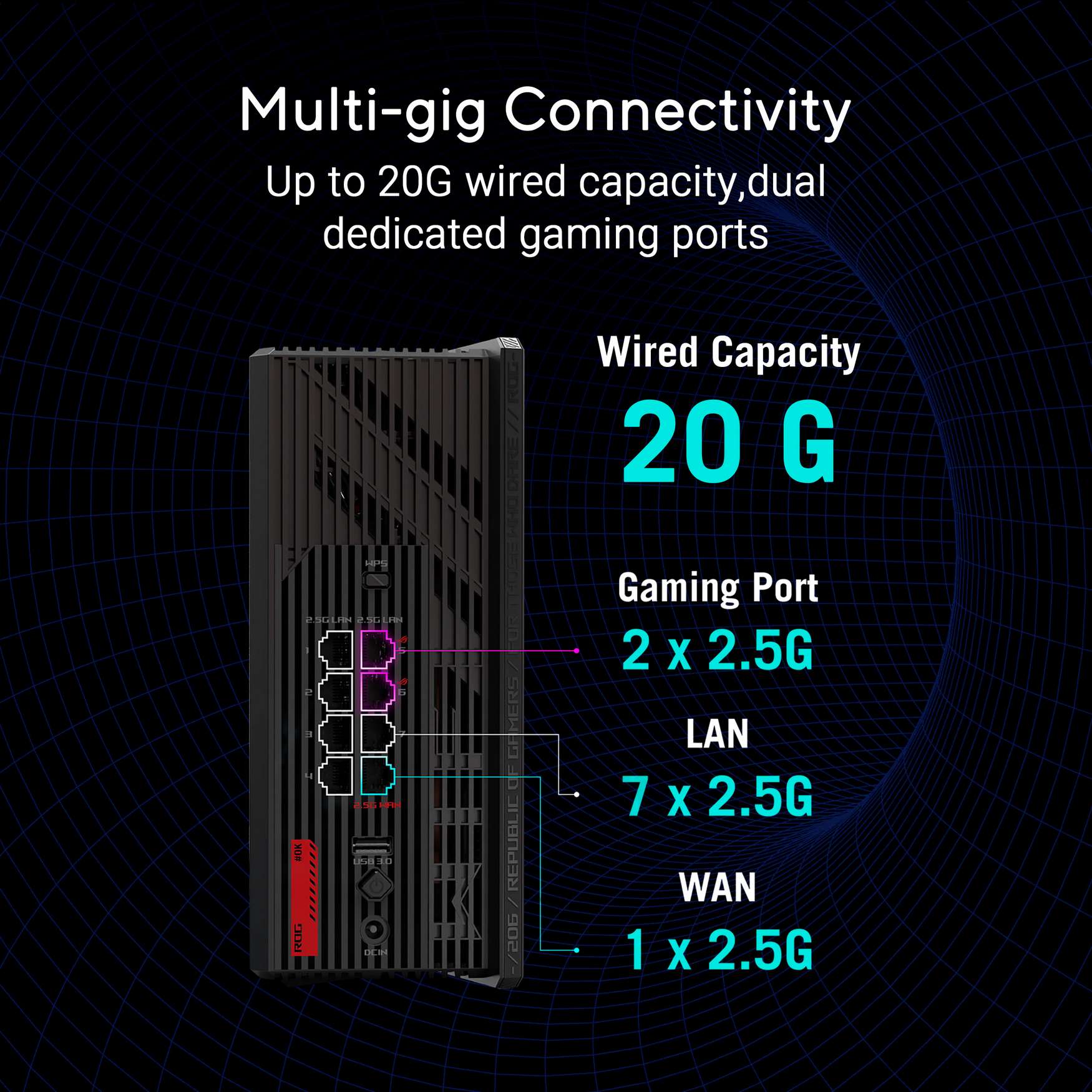 Il router ROG Strix GS-BE18000 è progettato per offrire un’esperienza di gioco senza compromessi, grazie alle sue due porte dedicate da 2,5G, ciascuna delle quali assegna automaticamente la priorità al traffico di gioco, senza necessità di configurazione manuale. Il ROG Strix GS-BE18000 sfrutta la tecnologia Smart Home Master ed i comodi SSID per fornire una connessione ottimizzata per il gaming intuitiva e multi-dispositivo. Questa combinazione garantisce prestazioni ottimali, fornendo ai giocatori un collegamento senza interruzioni e a bassa latenza, consentendo loro di raggiungere le massime prestazioni teoriche di rete.