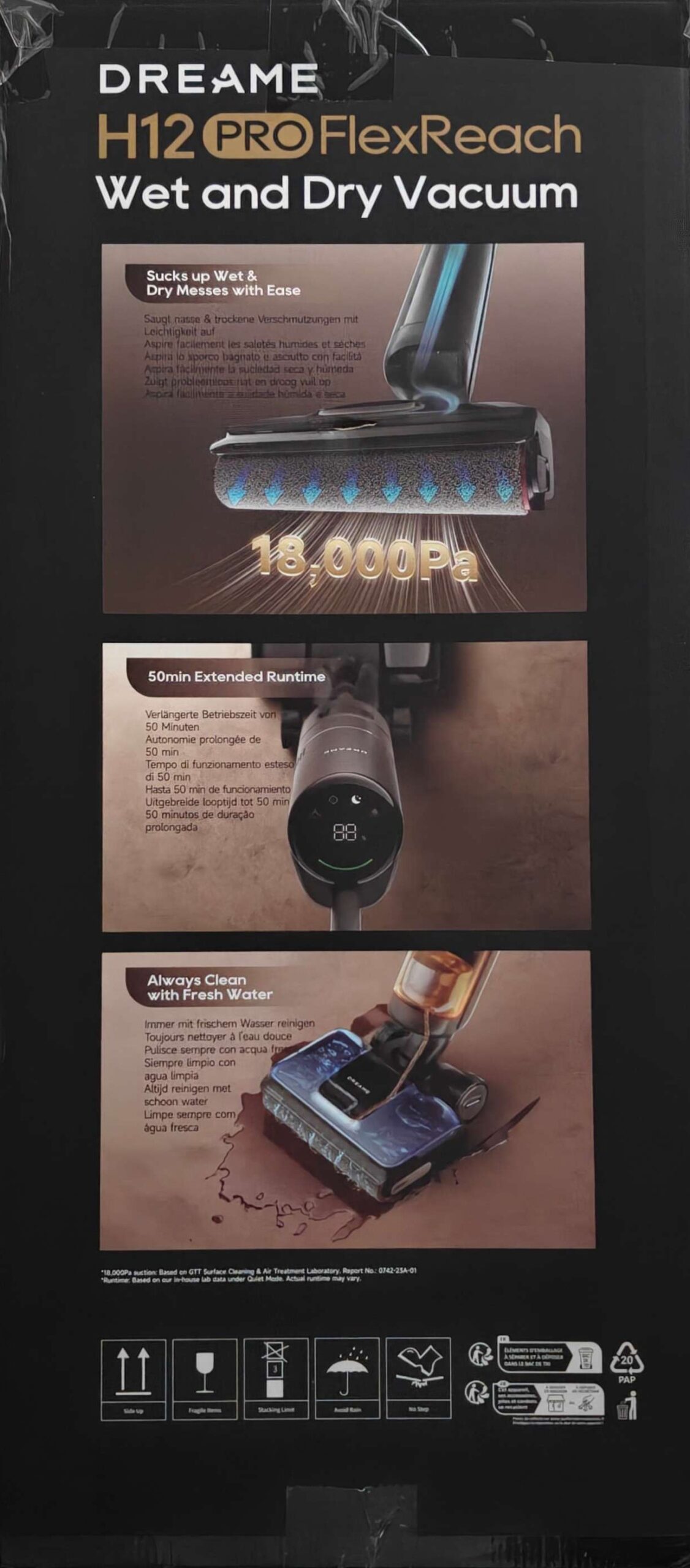 L’H12 Pro Flex Reach non scende a compromessi sulla potenza, con un motore da 400 W e un’aspirazione di picco di 18.000 Pa, gestisce con successo ogni tipo di sporco, dai liquidi alle incrostazioni più consistenti.