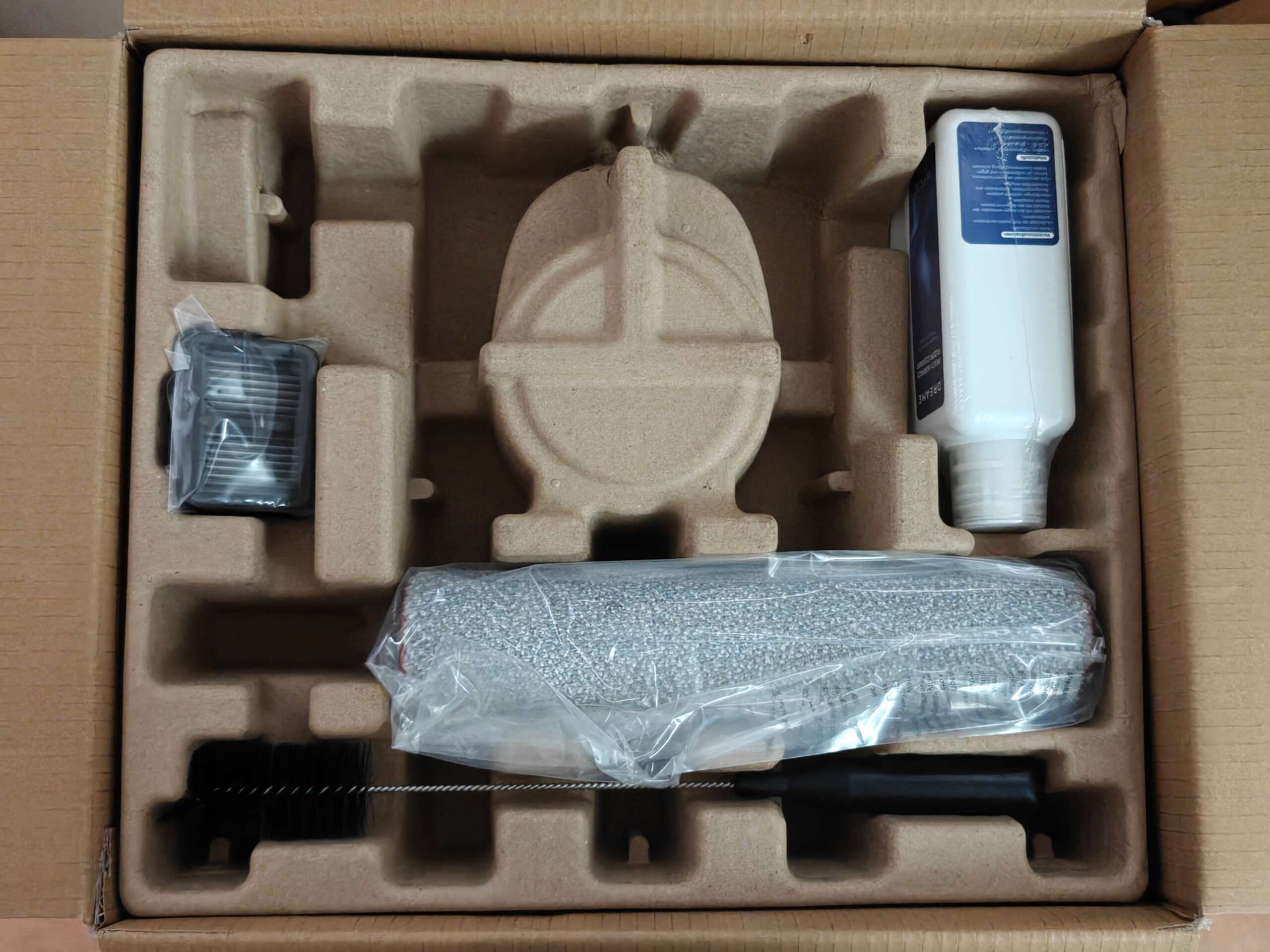 La confezione è molto grande, e considerando il contenuto non poteva essere altrimenti; una volta aperta troviamo uno scatolino contenente i vari accessori, ovvero, filtro, flacone per il detergente, spazzolina per la pulizia e il manico da montare.