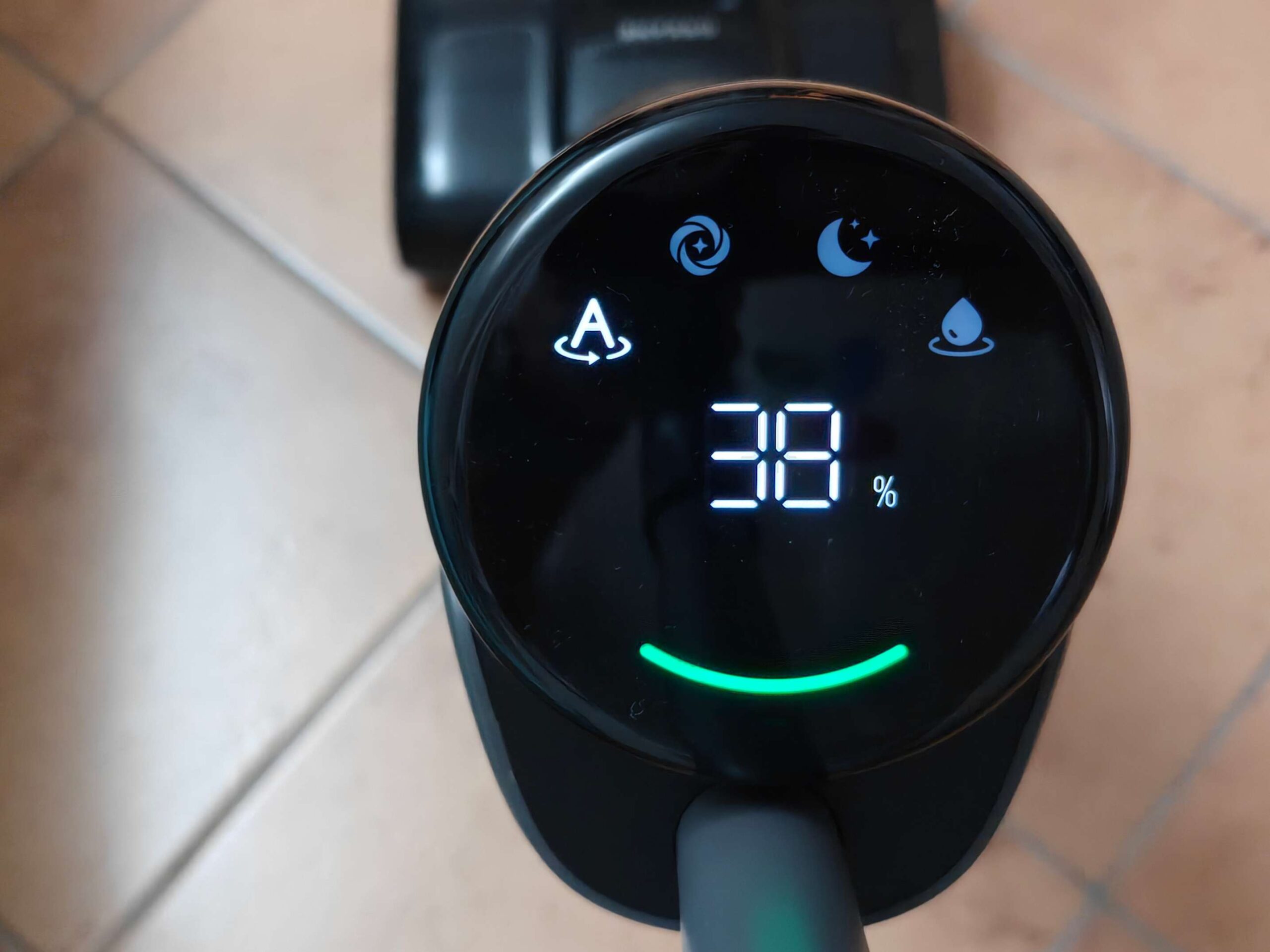 Superiormente, sulla parte centrale, troviamo il display a LED, luminoso e ben posizionato che fornisce indicazioni chiare sulla modalità in uso, il livello di sporco (tramite un anello colorato), e lo stato della batteria.
