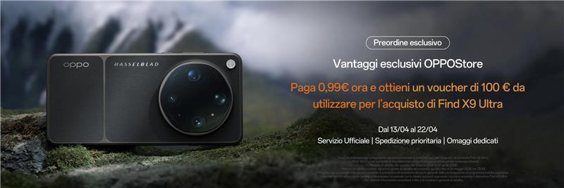 In occasione della fase di preordine fino al 22 aprile, OPPO inaugura una teasing phase dedicata su OPPO Store, offrendo agli utenti la possibilità di accedere a vantaggi esclusivi: al prezzo di Euro 0,99€ sarà possibile acquistare un voucher del valore nominale di Euro 100€ da utilizzare esclusivamente per l’acquisto di OPPO Find X9 Ultra, un’opportunità pensata per avvicinarsi in anticipo al nuovo flagship e assicurarsi condizioni privilegiate al momento del lancio.