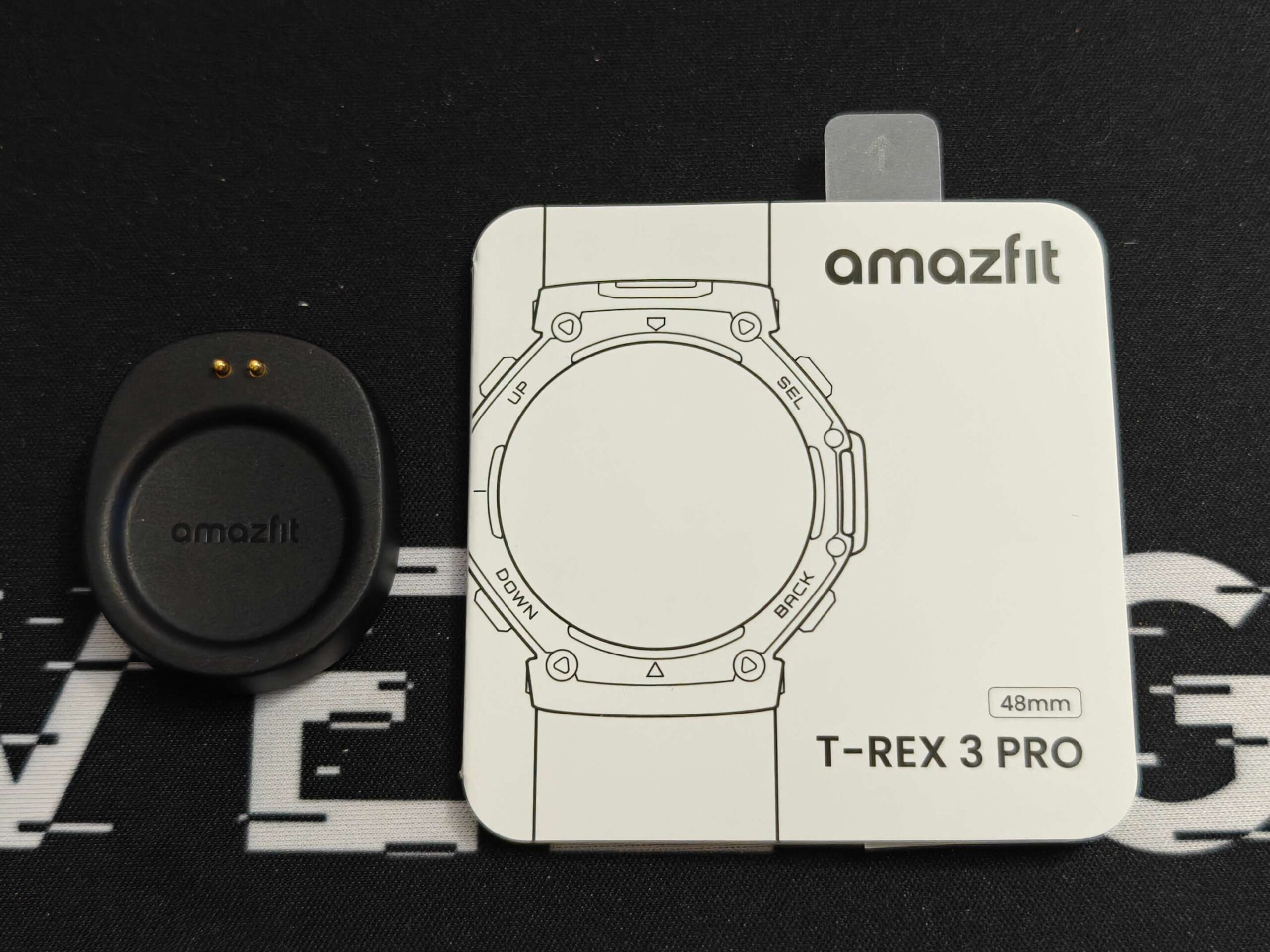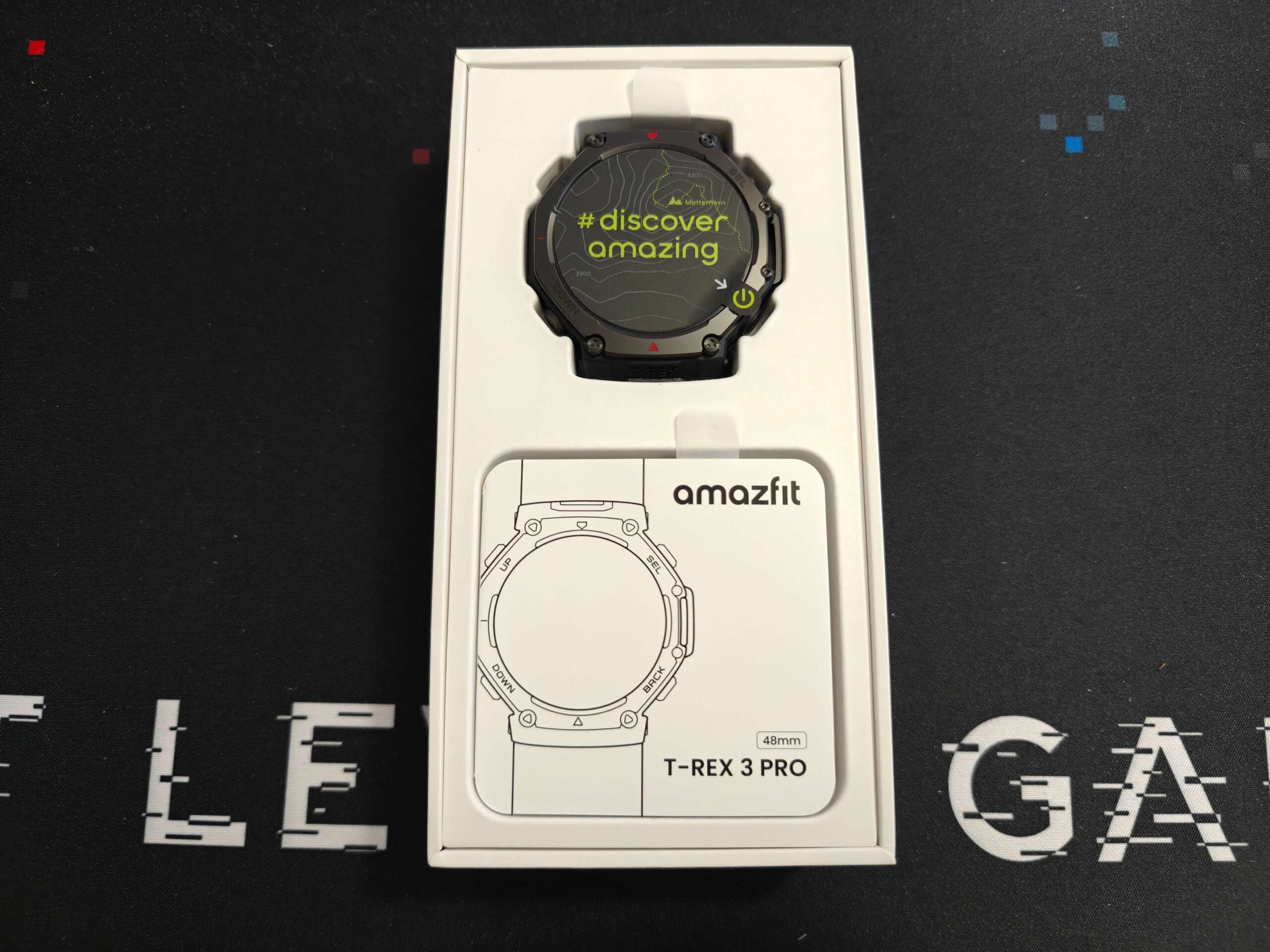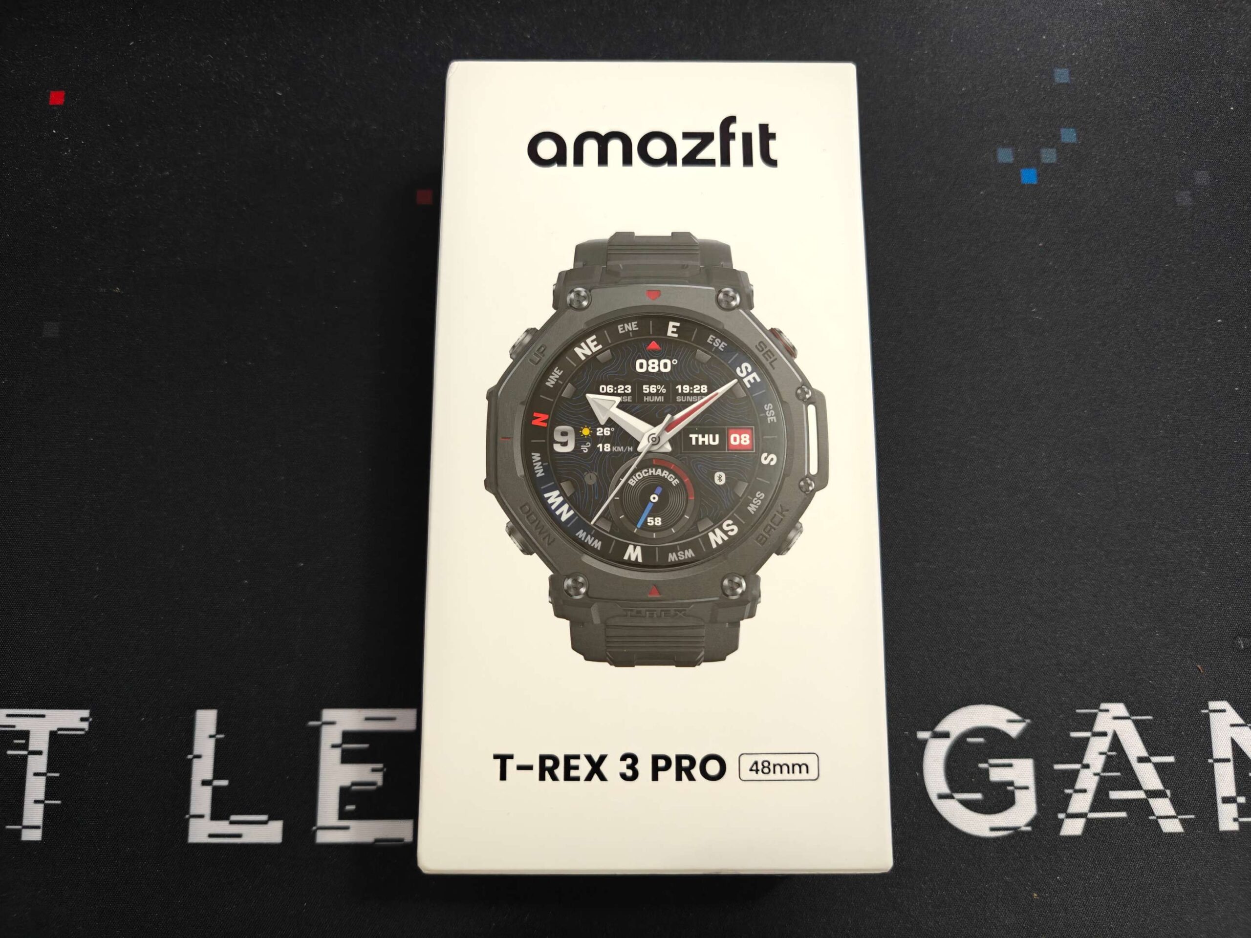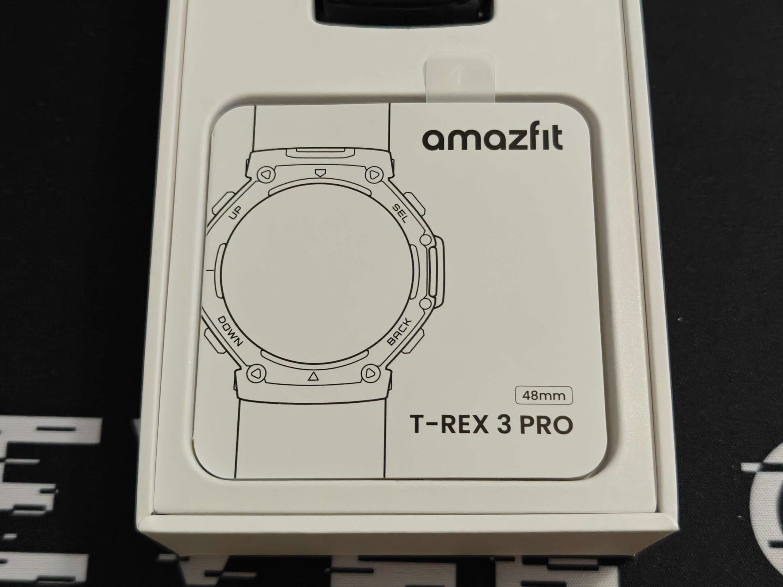 La confezione è di forma rettangolare e sviluppata in verticale con il T-Rex 3 Pro riposto nella metà superiore e senza cinturino; inferiormente è presente lo scatolino con basetta di ricarica (senza cavo) e guida utente. Nella parte sottostante è presente uno scompartimento con il cinturino in silicono e di colore nero.