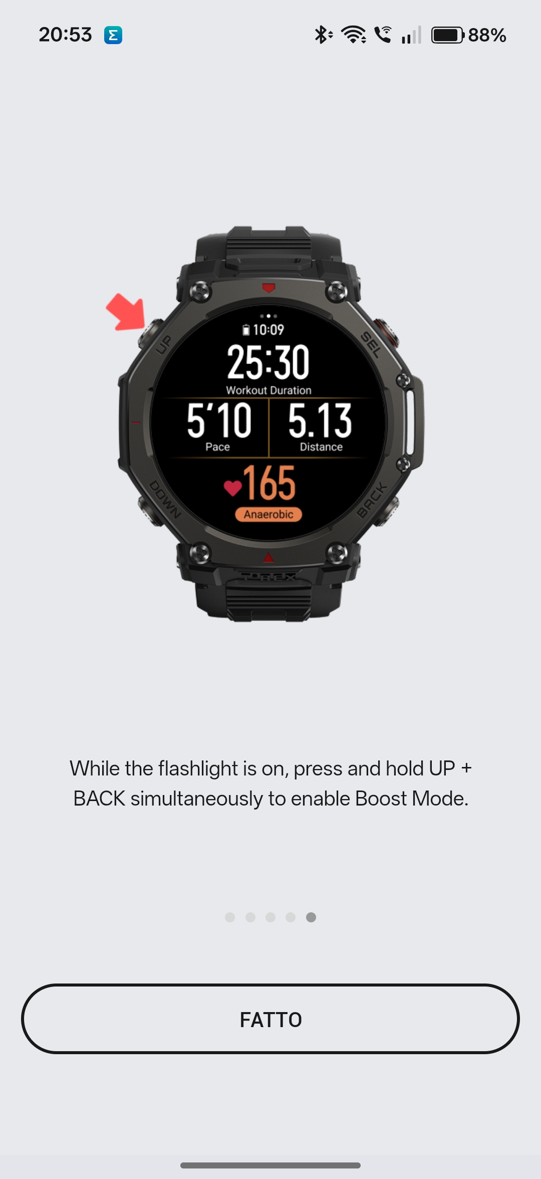 La torcia LED è integrata direttamente nella cassa e fa molta luce e nell’utilizzo di tutti i giorni è davvero comoda e permette di non tirare fuori il telefono se debbiamo illuminare un sentiero o per le piccole necessità (cercare oggetti nello zaino o muoversi in tenda), con la comodità che il fascio punta proprio dove si tiene il braccio. Si attiva velocemente tenendo premuto il tasto superiore sinistro e può essere impostata anche su luce rossa per le emergenze o per rendersi visibili durante la corsa serale senza abbagliare.