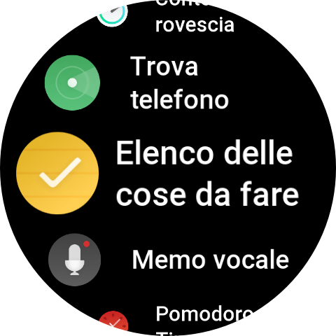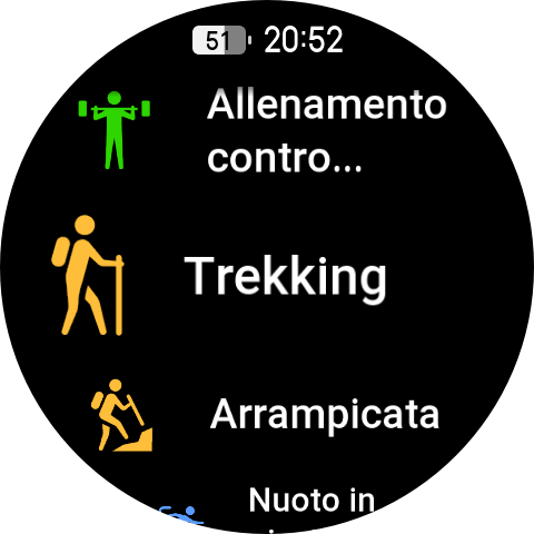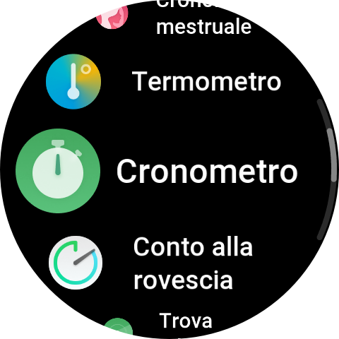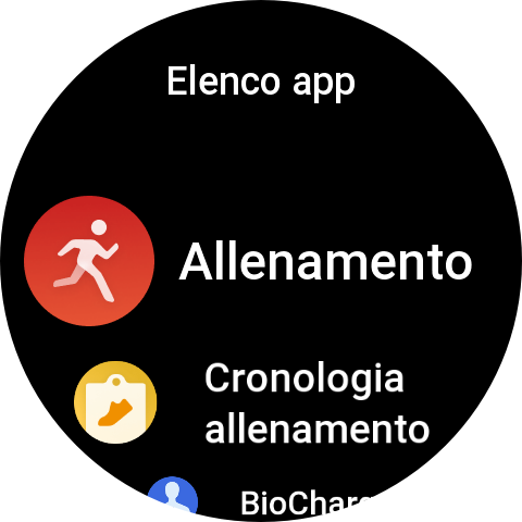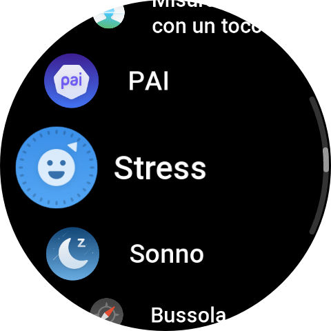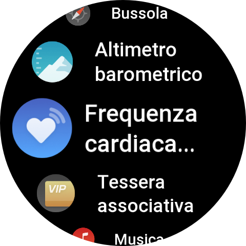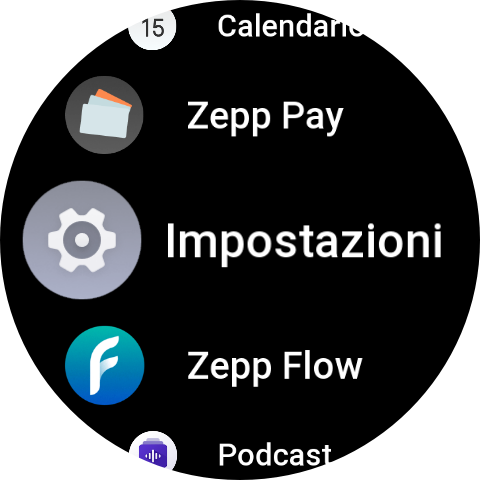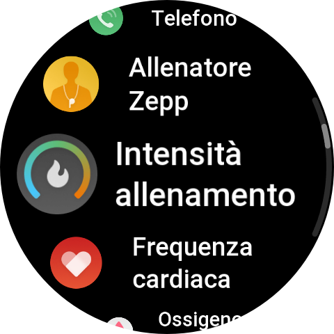 Tramite una pressione del pulsante inferiore, abbiamo accesso alle varie app presenti, Allenamento, Cronologia allenamento, Allenatore Zepp, Intensità allenamento, Prontezza, Frequenza cardiaca, Ossigeno nel sangue, Stress, Misurazione con un tocco, PAI, Attività, Sonno, Mappa, Bussola, Altimetro barometrico, Meteo, Musica, Sveglia, Tessera associativa, Calendario, Zepp Pay, Frequenza cardiaca spinta, Impostazioni, Meditation, Zepp Flow, HRV, Sole e Luna, Cronologia mestruale, Termometro, Cronometro, Conto alla rovescia, Trova telefono, Elenco delle cose da fare, Memo vocale, Pomodoro timer, Orologio universale, Respirazione.