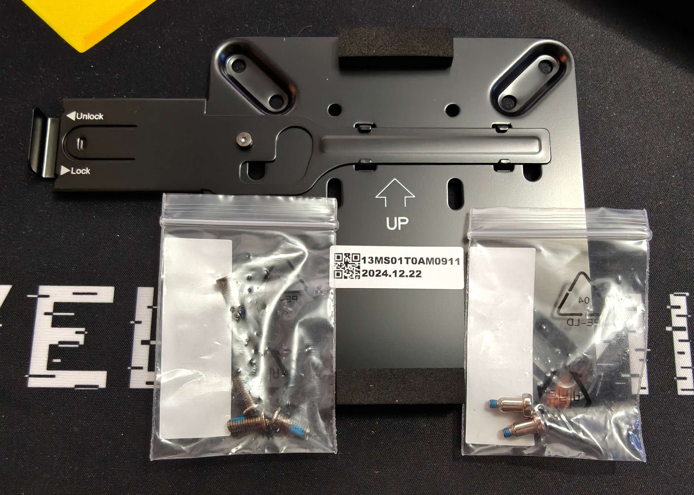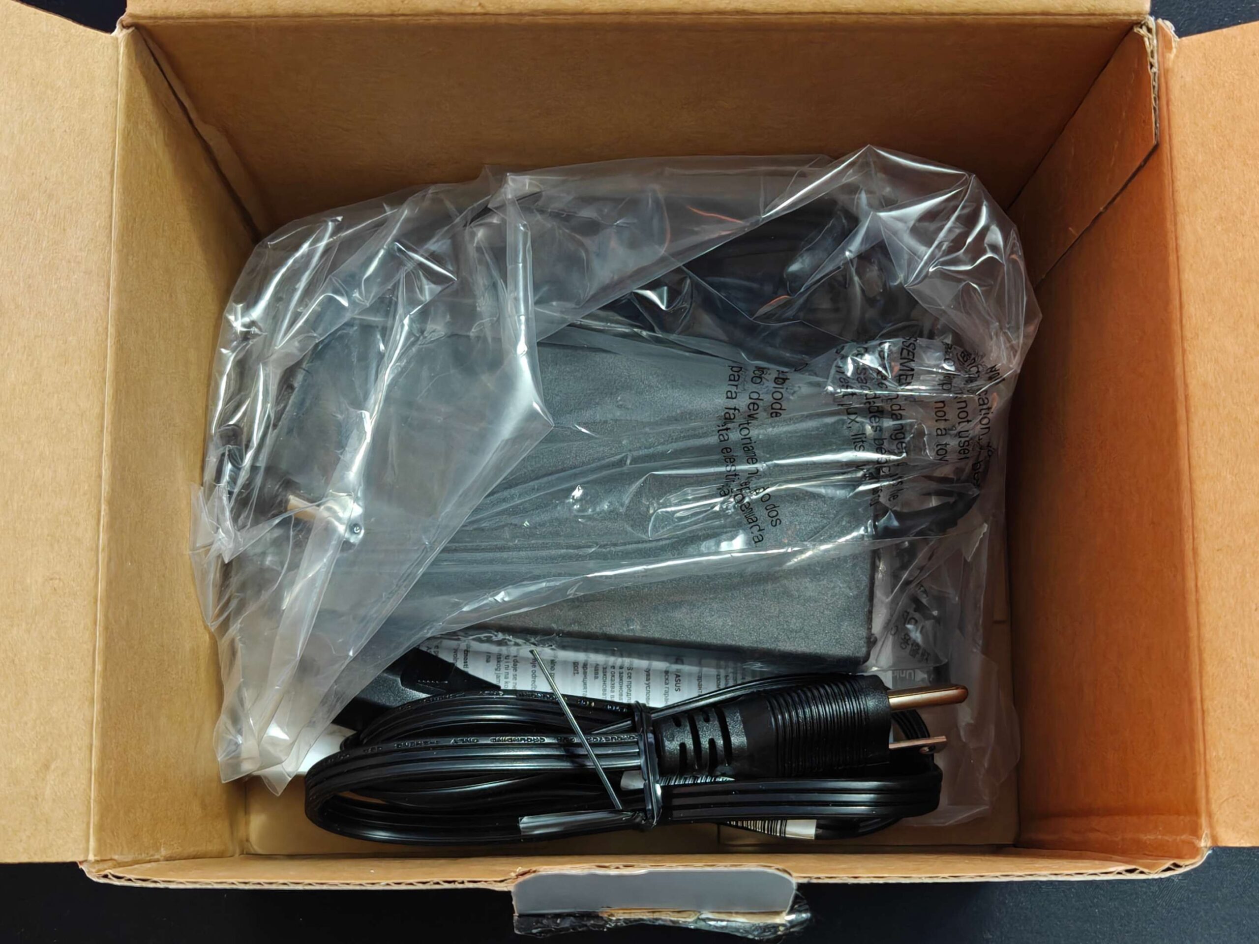 La confezione è di fattura economica, e oltre all’ASUS PN54, troviamo alimentatore purtroppo con con connettore proprietario, cavo di collegamento alla presa elettrica, staffa VESA e viti per il montaggio.