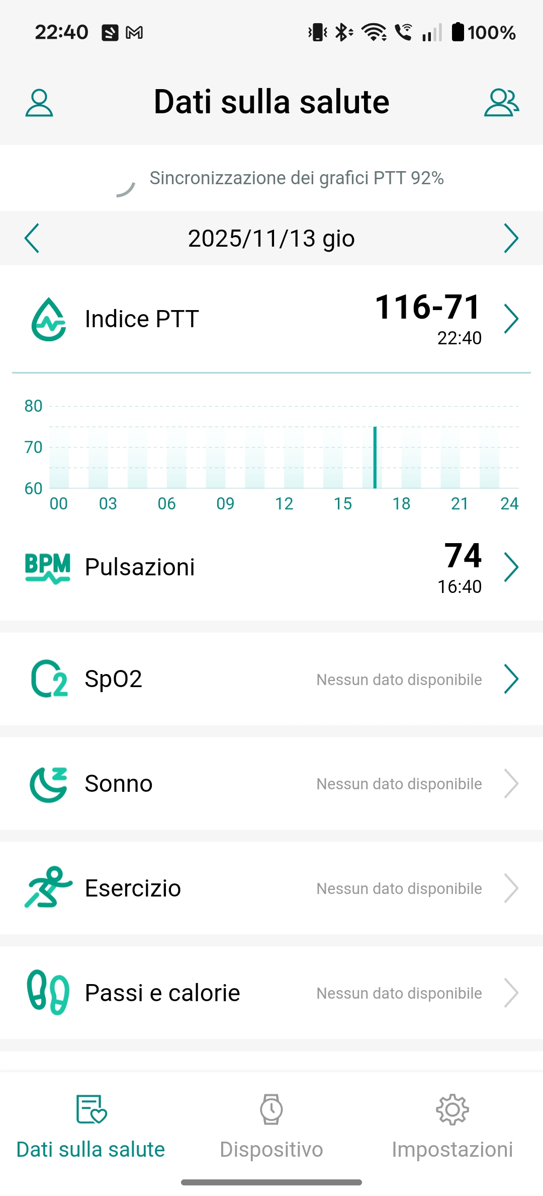 Il cuore dell’utilizzo risiede nelle misurazioni avanzate. Per rilevare la Pressione (PTT) o l’ECG, l’utente seleziona la funzione e appoggia il polpastrello sul sensore integrato nella cornice superiore. L’orologio stesso guida l’utente a mantenere la posizione corretta, rendendo l’operazione intuitiva e veloce, nonostante la complessità della misurazione.