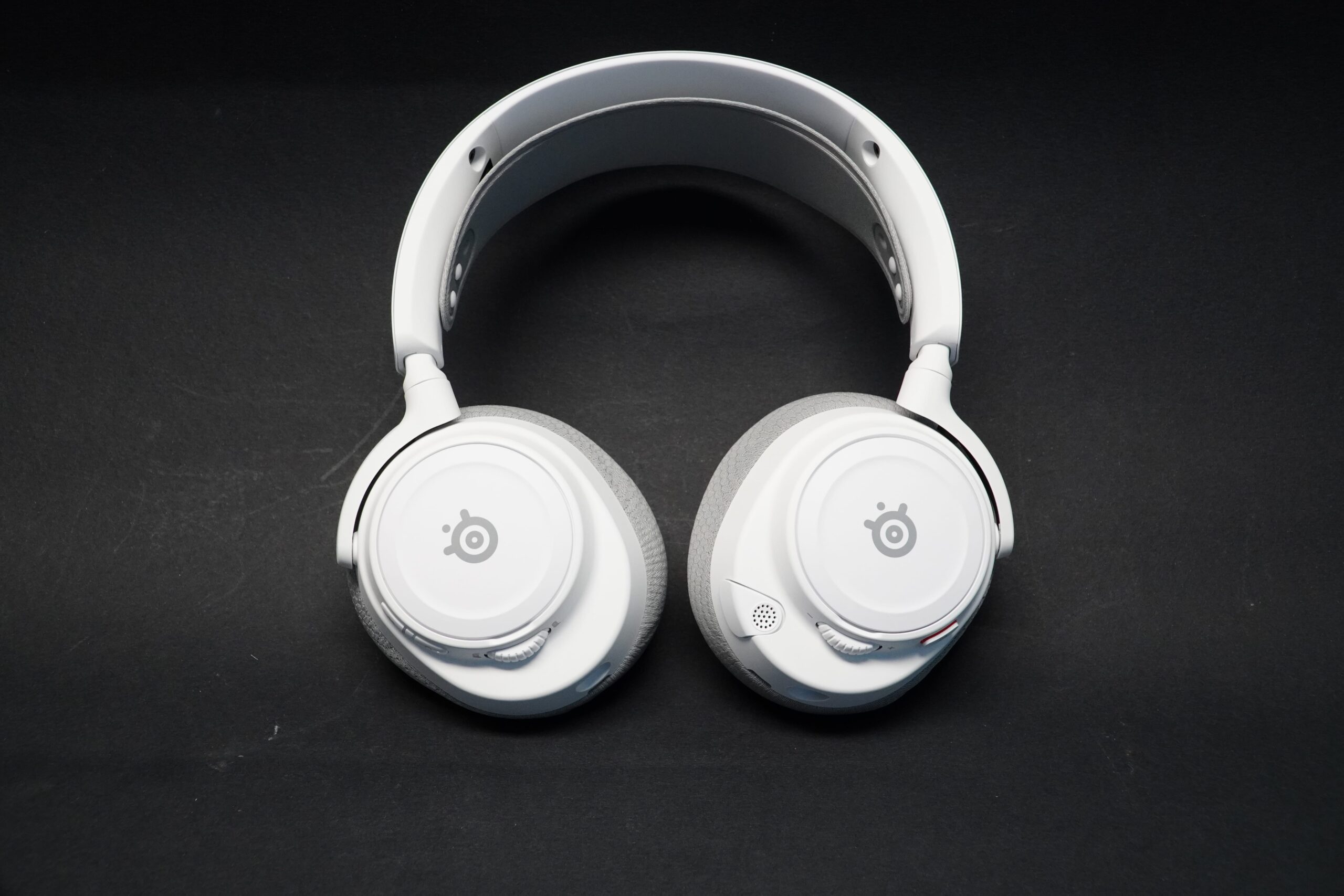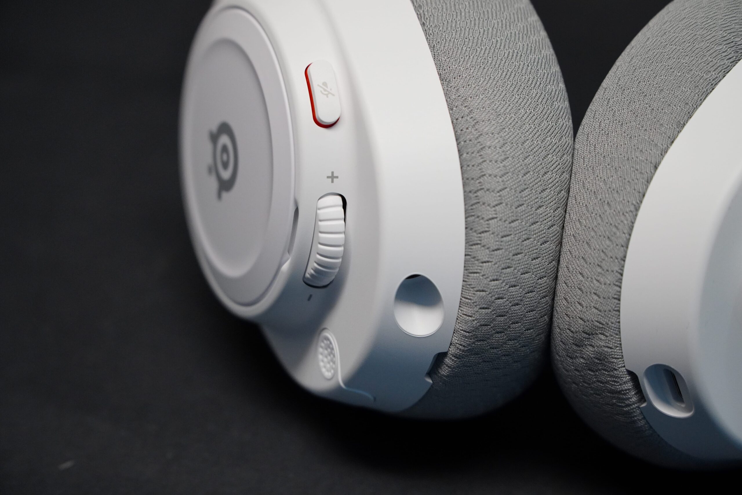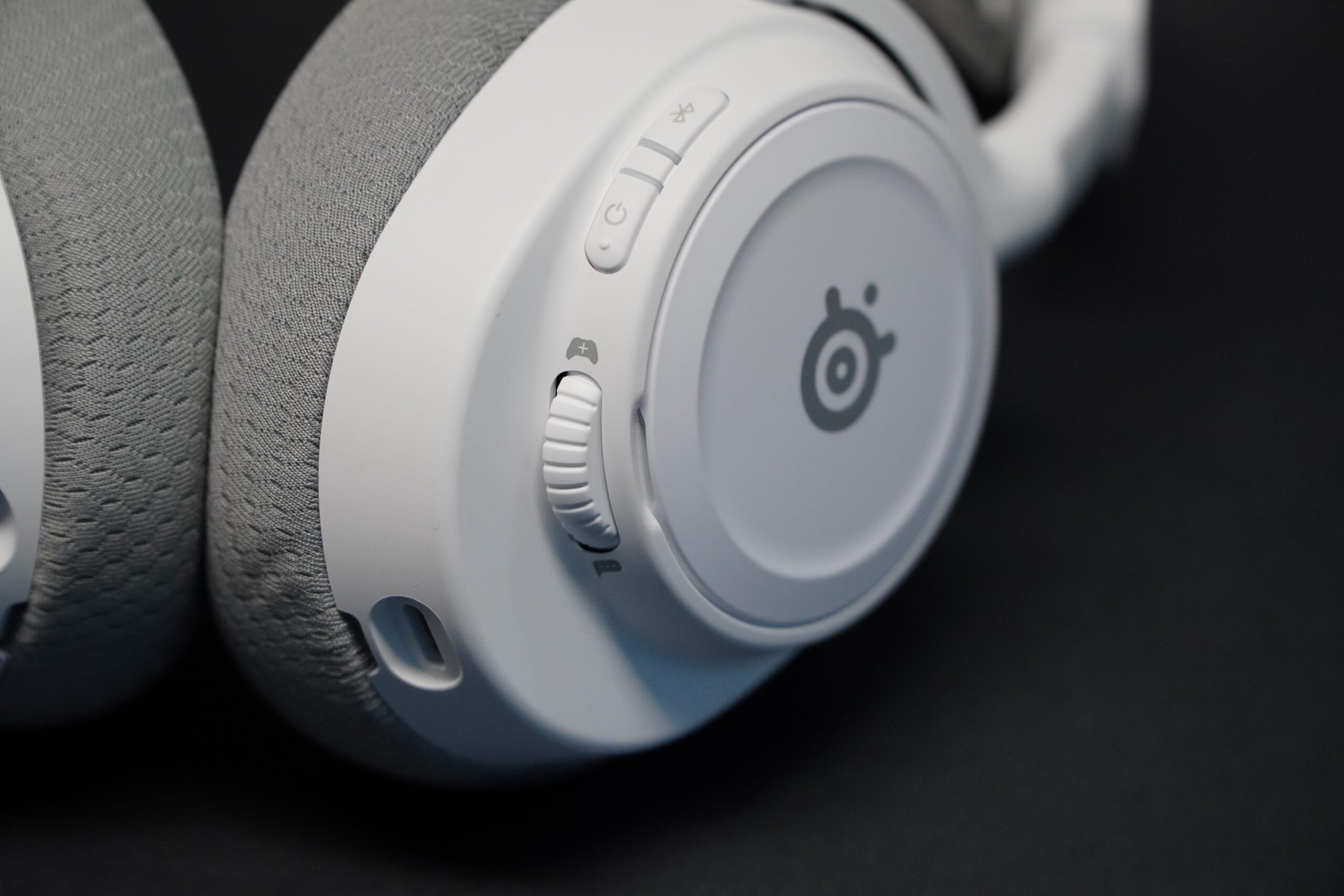 Esternamente, su entrambi i padiglioni troviamo il logo SteelSeries; sul destro sono presenti la rotella per il volume, il pulsante multifunzione per accensione/spegnimento e mute (con LED rosso di promemoria), mentre sul sinistro il pulsante Bluetooth per rispondere alle chiamate, saltare tracce (doppio/triplo clic per play/pausa e navigazione musicale) e il bilanciamento ChatMix.