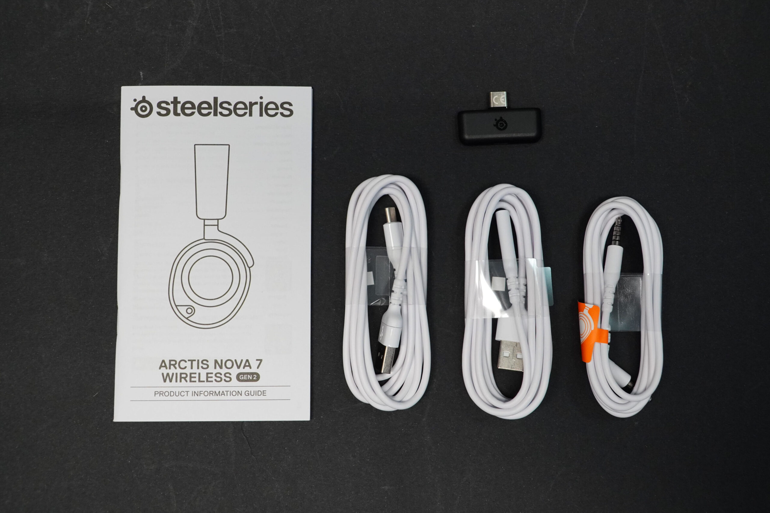 La confezione è di discrete dimensioni, e al suo interno troviamo le cuffie, dongle USB‑C multipiattaforma con adattatore USB‑A per PC, console e dispositivi mobili, cavo USB‑C per ricarica e jack da 3,5 mm per l’uso cablato, oltre alla manualistica rapida.