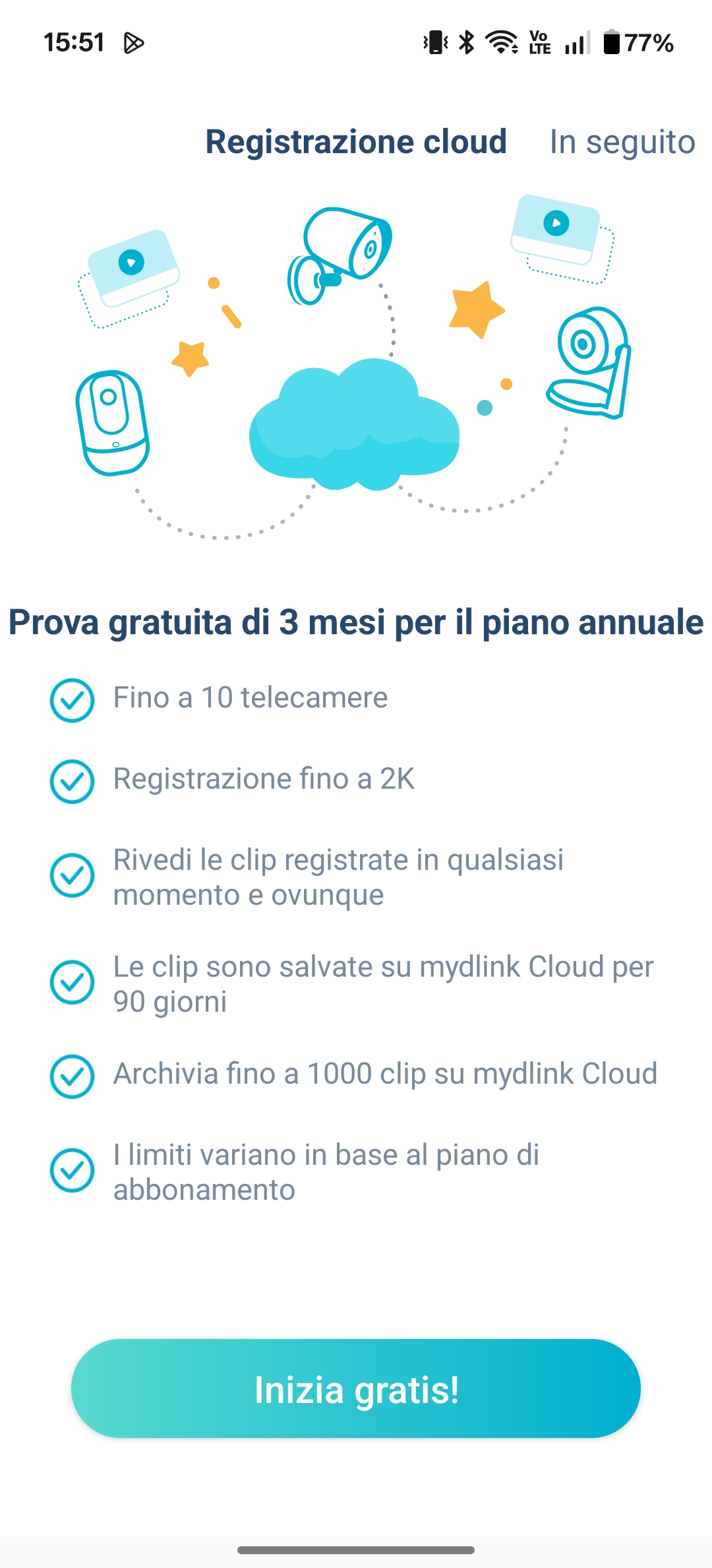 È inoltre disponibile il solito servizio cloud opzionale per il backup remoto dei video (con prova gratuita e piani a pagamento).