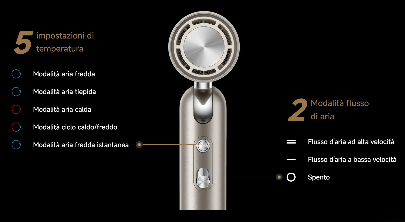 L’utente ha a disposizione 5 modalità di temperatura e 2 velocità di flusso d’aria, un ventaglio di opzioni sufficiente per personalizzare l’asciugatura a seconda del tipo di capello o styling desiderato.