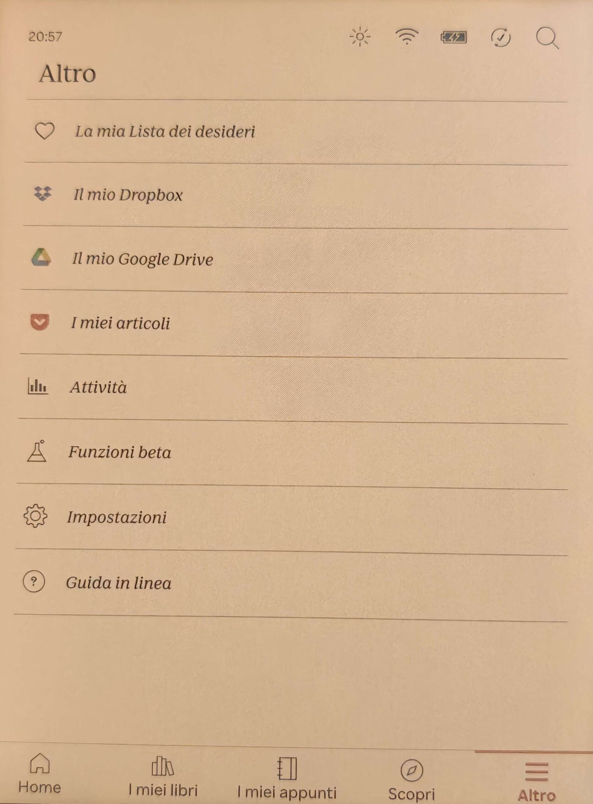 Una delle migliori caratteristiche nell’uso quotidiano è la ComfortLight PRO. È possibile impostare l’e-reader in modo che la temperatura del colore (da luce fredda a luce calda/ambra) si regoli automaticamente in base all’ora del giorno. Questo riduce l’emissione di luce blu man mano che si avvicina la sera, ottimizzando la preparazione al sonno. Inoltre, la Modalità Scura (Dark Mode) inverte i colori per visualizzare testo chiaro su sfondo scuro, una funzionalità molto apprezzata per la lettura al buio che riduce ulteriormente l’affaticamento degli occhi.