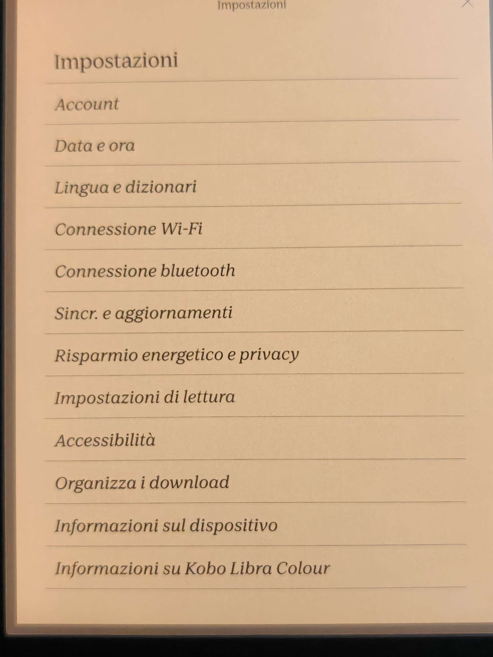 Il vero protagonista del Kobo Libra Colour è il suo innovativo display E Ink Kaleido 3, la cui resa è cruciale per l’esperienza utente. Per quanto riguarda il testo tradizionale in bianco e nero, lo schermo offre una nitidezza ottimale grazie a una risoluzione di 300 PPI (1264 x 1680 pixel). Tuttavia, quando si visualizzano i contenuti a colori, la risoluzione si dimezza a 150 PPI a causa della matrice filtrante (CFA) necessaria per la tecnologia E Ink. Sebbene questa matrice consenta di visualizzare 4096 tonalità di colore, è importante notare che la resa cromatica è intenzionalmente caratterizzata da tonalità naturali e moderate, non paragonabile alla saturazione di un display LCD o OLED. A compensare le variazioni di contrasto interviene la funzione ComfortLight PRO, che si rivela essenziale: permette di regolare con precisione sia la luminosità che la temperatura del colore (riducendo la luce blu), garantendo così un’esperienza di lettura riposante e ben bilanciata in qualsiasi condizione di luce.