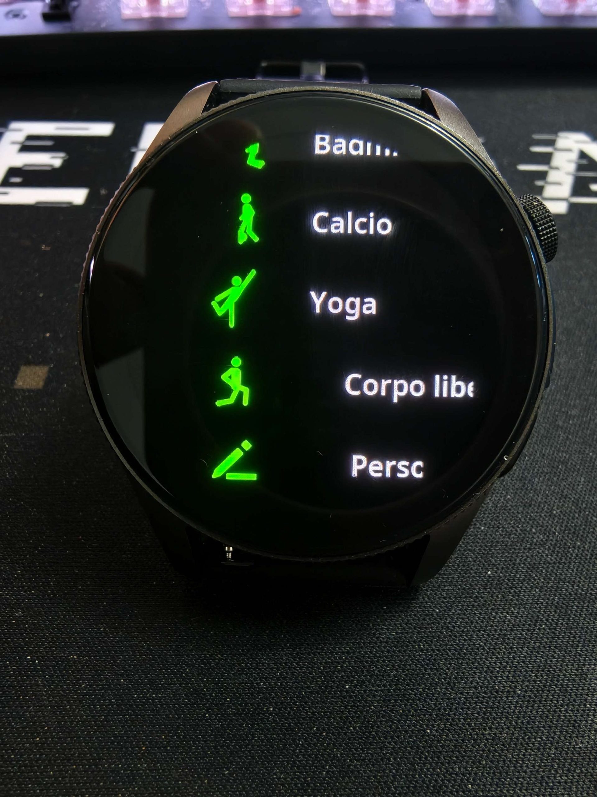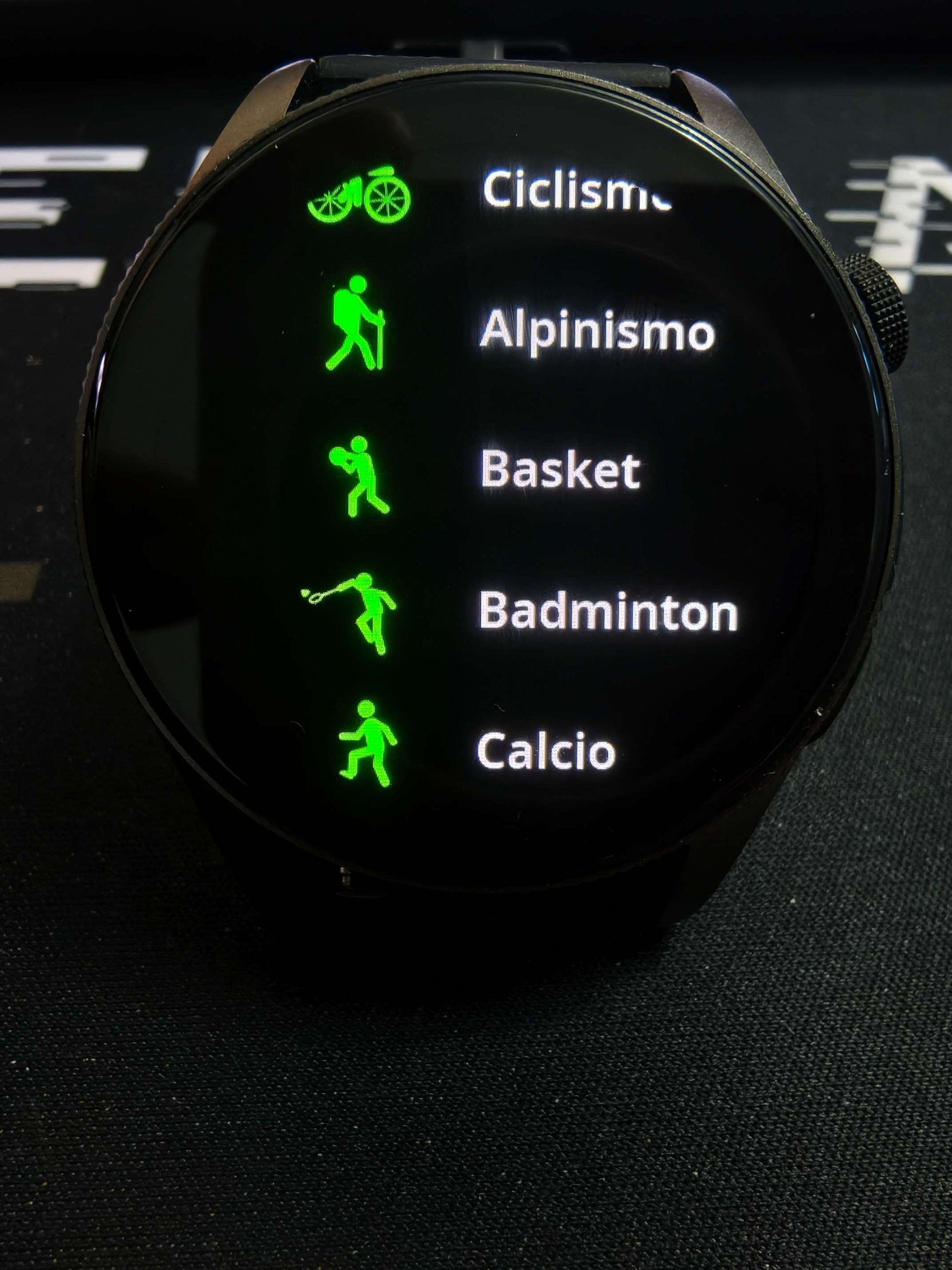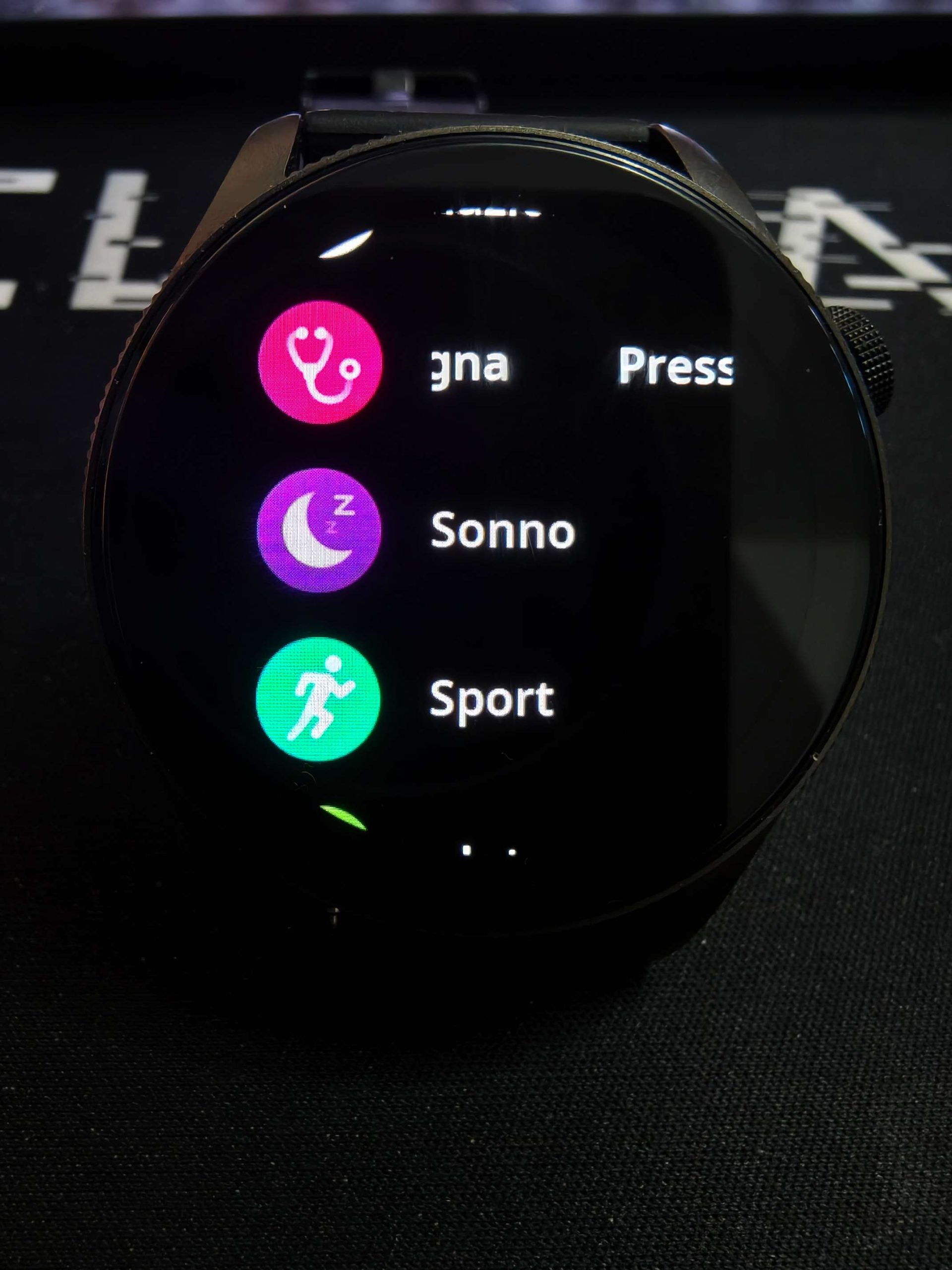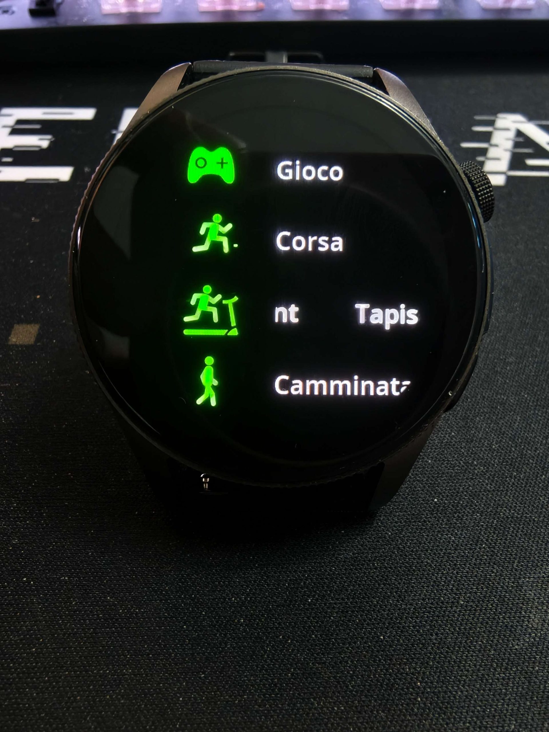 Tramite una pressione del pulsante inferiore, possiamo accedere alle varie modalità sportive. Durante l’uso delle applicazioni, lo stesso tasto può essere usato anche per tornare indietro di un passaggio, rendendo l’interazione più veloce rispetto al solo utilizzo del touch.
