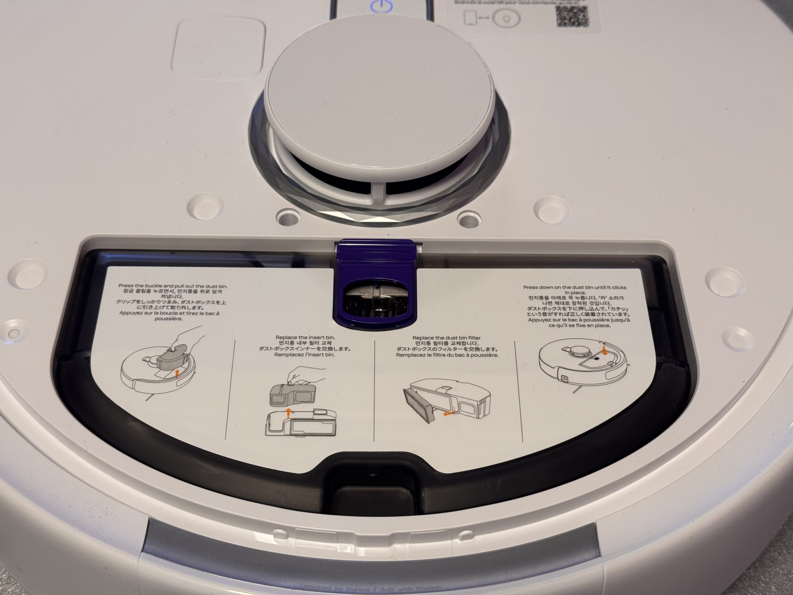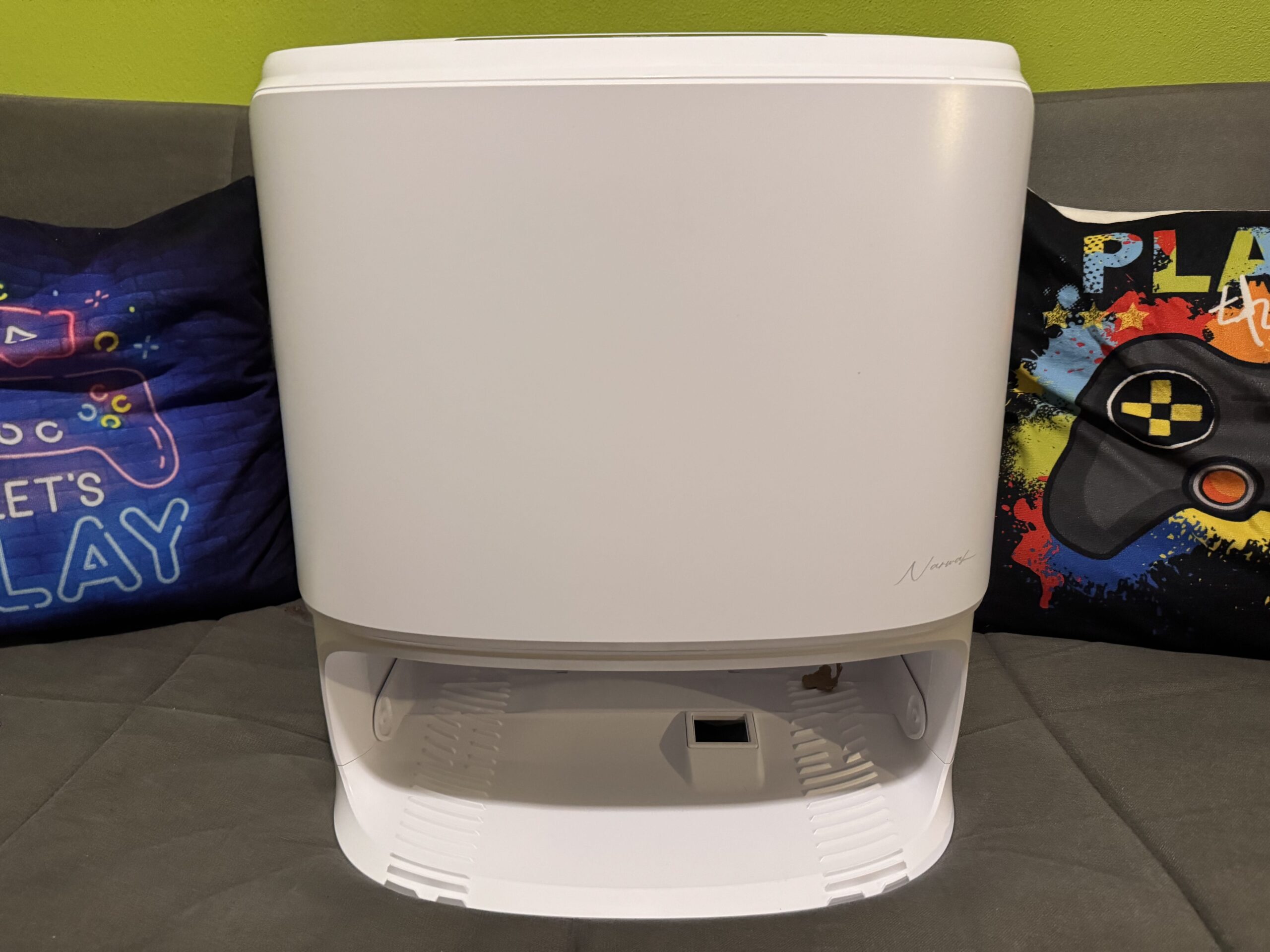 La base di ricarica, di color bianco elegante, combina dimensioni generose con un design compatto (461 x 430 x 388 mm). All’interno, sul lato sinistro, si trova il comparto per la raccolta della polvere con sacchetto da 2,5 litri, mentre in basso è collocato l’alloggiamento del robot.