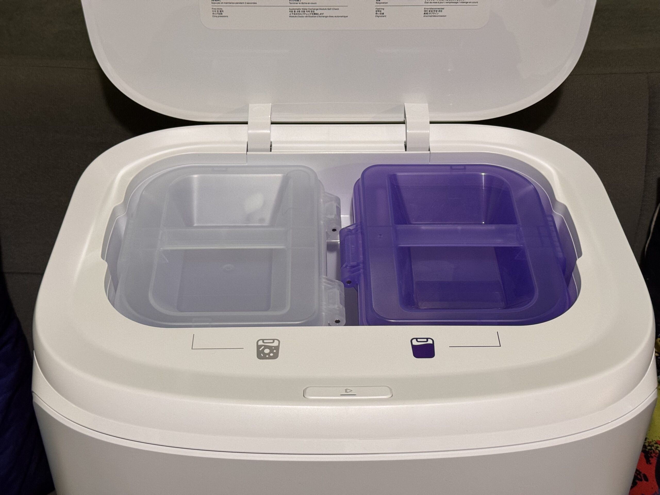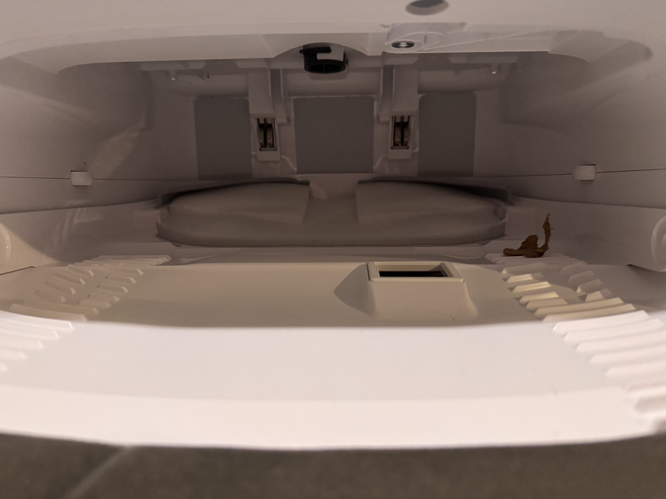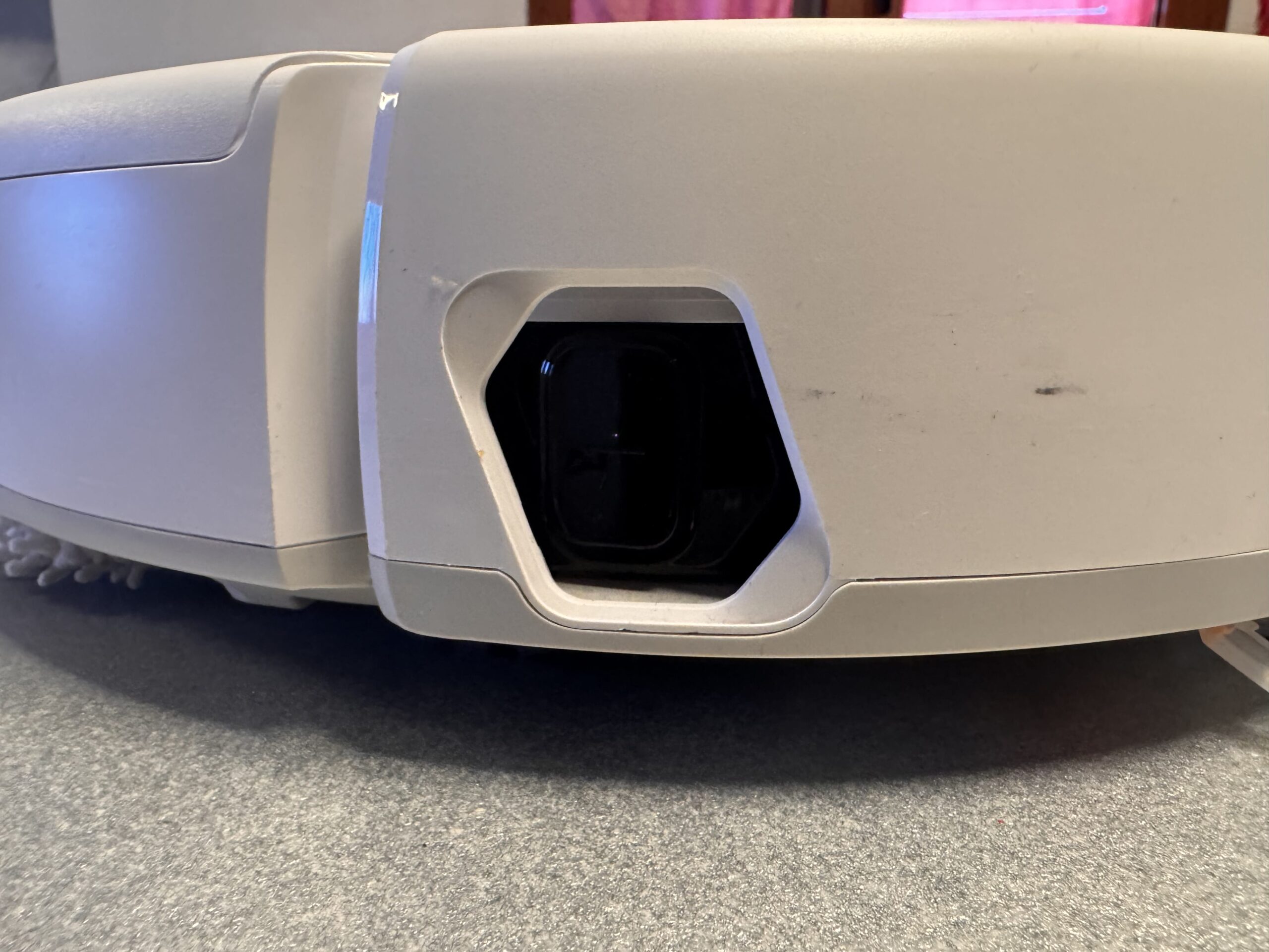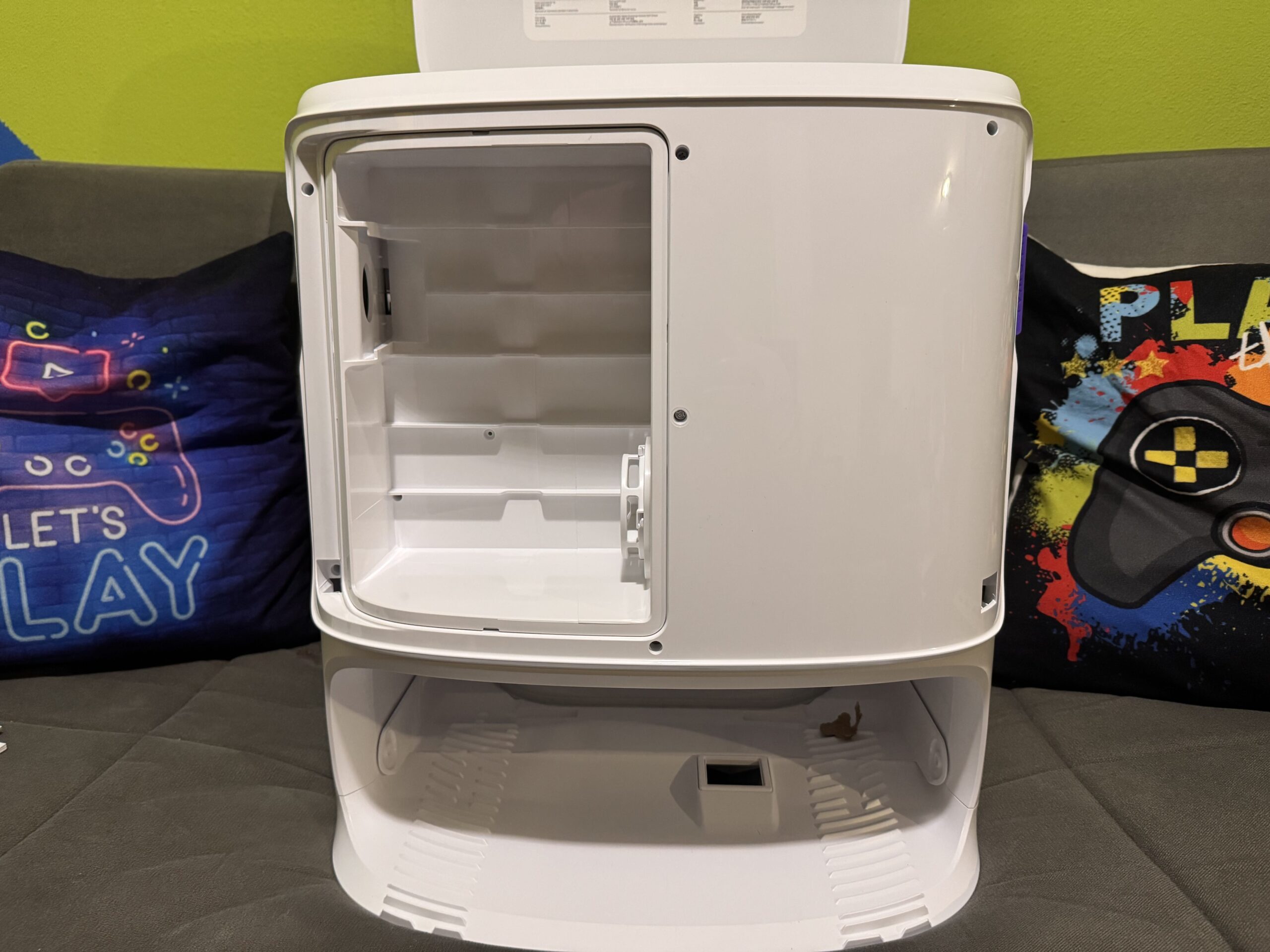 Nella parte superiore sono presenti i LED di stato e uno sportellino che nasconde i due serbatoi: a sinistra quello per l’acqua sporca (4,75 L) e a destra quello per l’acqua pulita (5 L). Sul retro è previsto l’ingresso per l’alimentazione, anche se manca un vano passacavo dedicato.