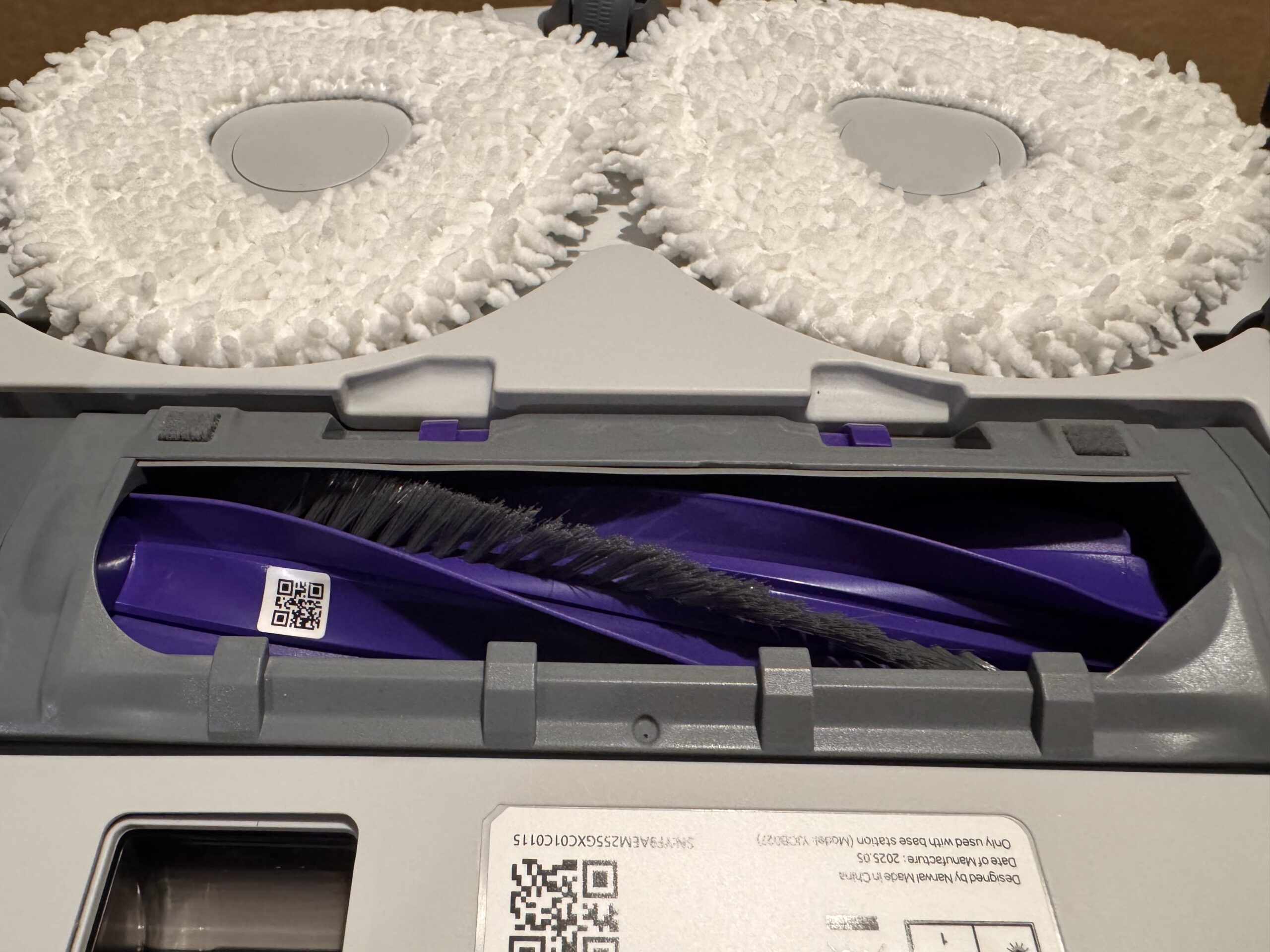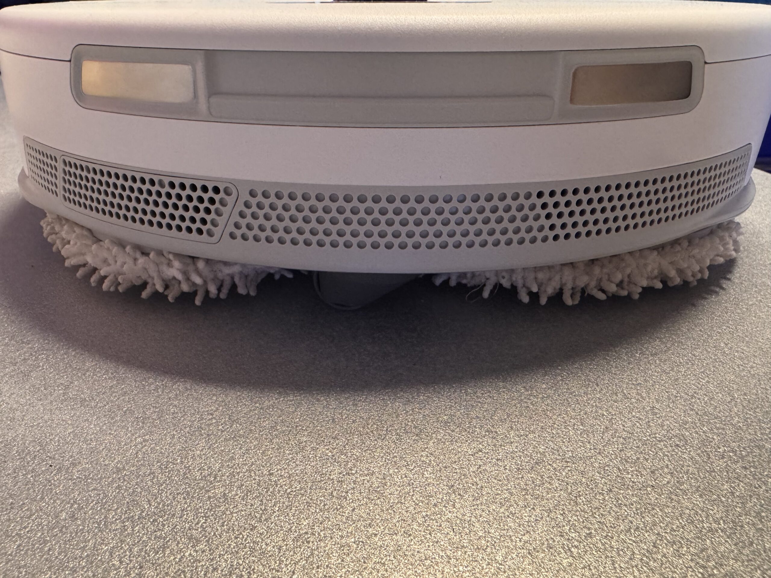 Sulla parte superiore si trova un coperchio magnetico removibile che nasconde il vano raccoglipolvere, mentre al centro campeggia la torretta con il pulsante di accensione e spegnimento. Nella parte inferiore sono disposte la spazzola centrale, le due ruote motrici, la spazzola laterale rotante e l’area magnetica per l’aggancio del panno lavapavimenti, affiancata da una ruotina direzionale.