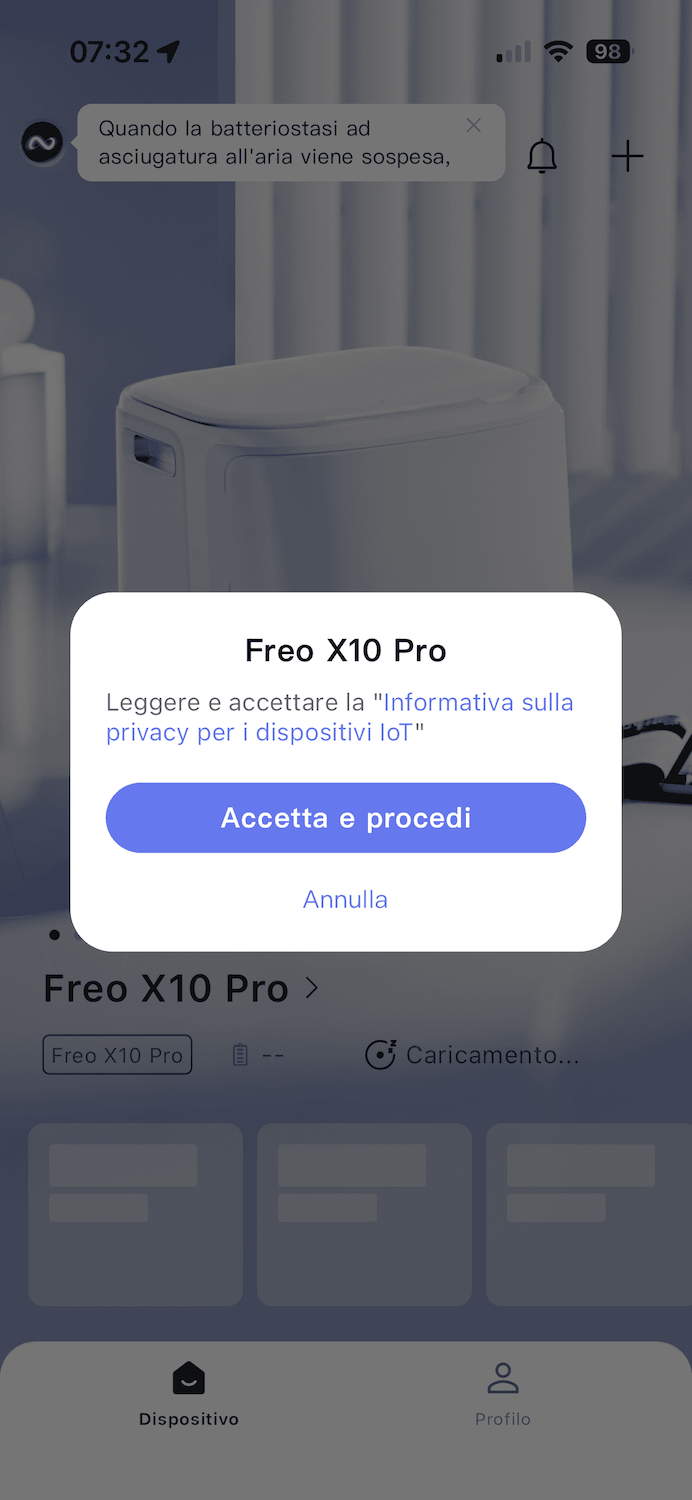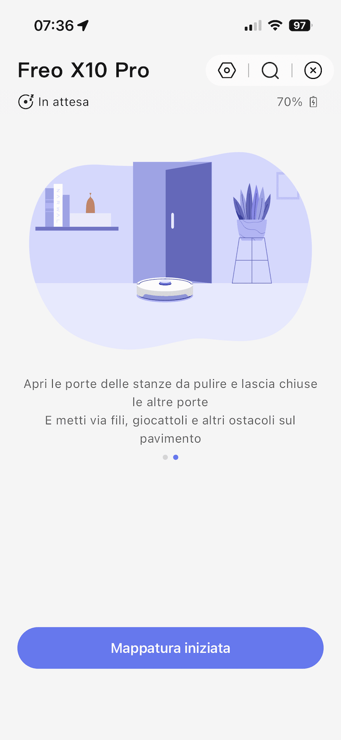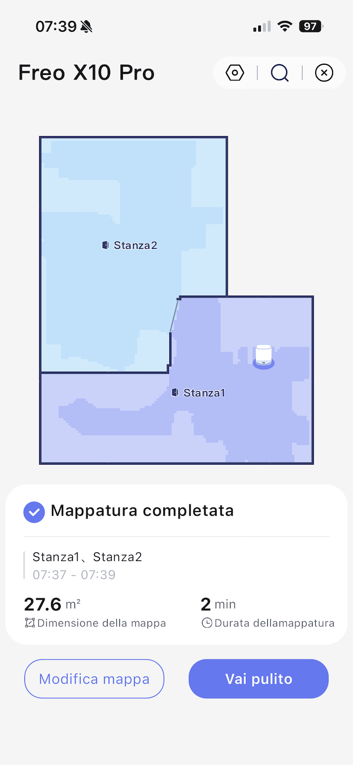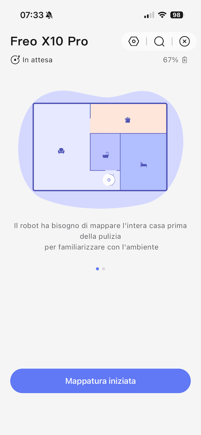 Il processo di configurazione è completamente guidato e avviene passo dopo passo. Dopo la connessione iniziale, l’app chiede di assegnare un nome all’abitazione e procede automaticamente alla ricerca e all’installazione di eventuali aggiornamenti firmware. Successivamente, il robot può avviare la prima sessione di pulizia per la creazione della mappa 3D dell’ambiente domestico, indispensabile per la navigazione precisa e la pianificazione delle aree di lavoro.