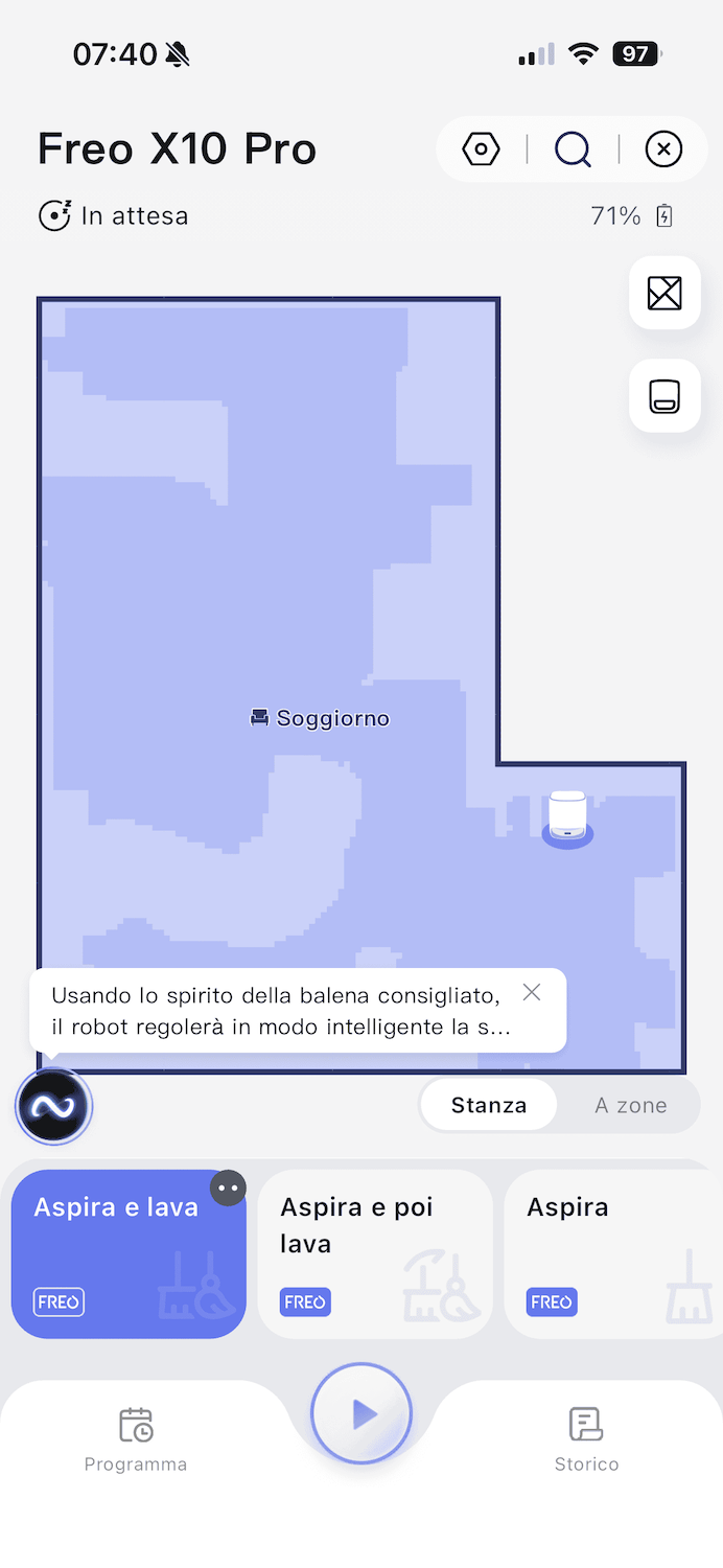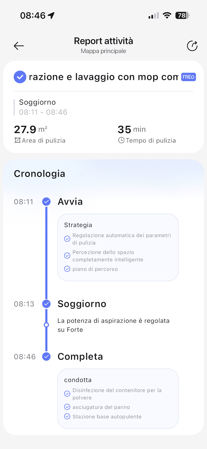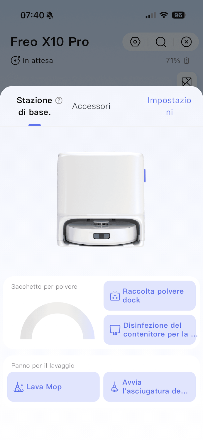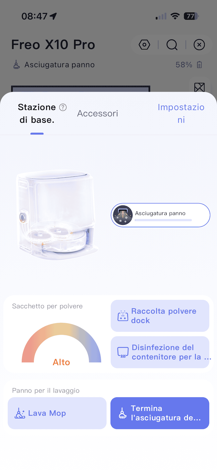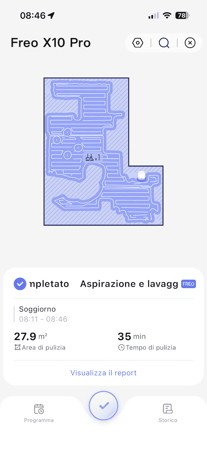 Una volta completata la mappatura, il Freo X10 Pro entra a pieno regime. La stazione di pulizia automatica gestisce in autonomia il lavaggio e l’asciugatura dei panni, mantenendoli sempre puliti e pronti all’uso senza interventi manuali.