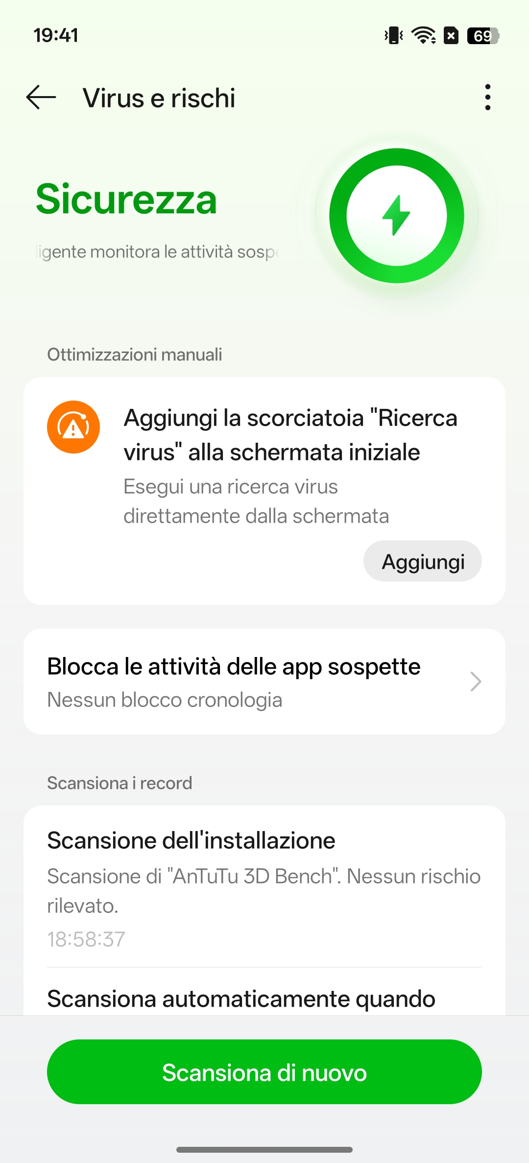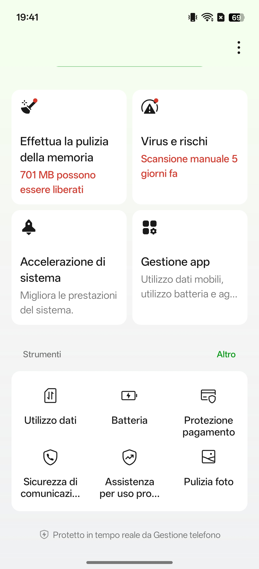 Tramite l’app Gestione Telefono è possibile, appunto, gestire il telefono effettuando varie operazioni, come per esempio ottimizzare il dispositivo, fare pulizia delle app che risiedono in memoria, vedere l’utilizzo dei dati, il filtro molestie, la durata della batteria ed effettuare la Scansione Virus.