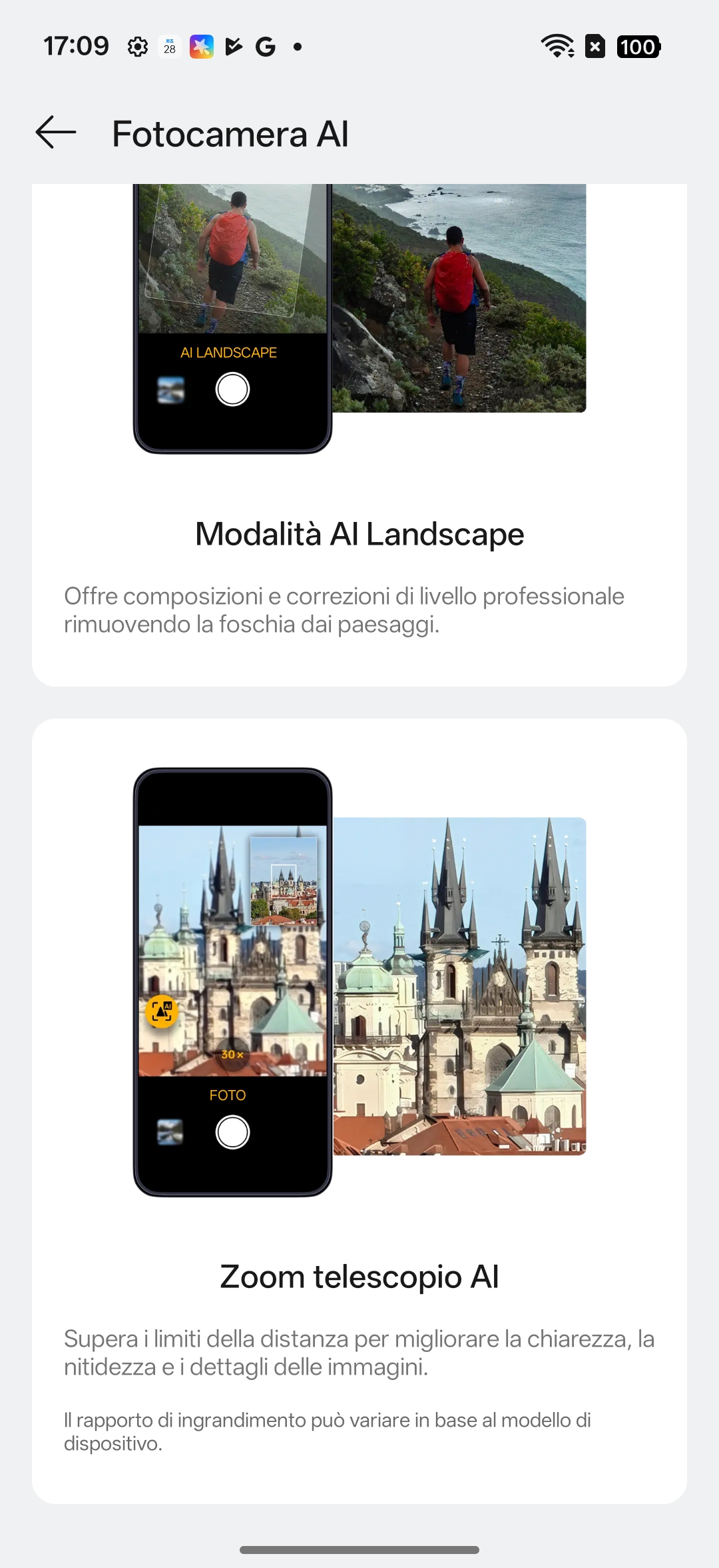 L’app Fotocamera offre un discreto numero di modalità preimpostate, ovvero, AI Landascape, Ricoh GR, Ritratto, Notte, Pro, Hi-Res, Panoramica, Cibo, Video Pro, Slow motion, Time-Lapse, Lunga Esposizione, Video a doppia Vista, Subacquea, Scanner di Testi, Scanner documenti, Modalità cielo stellato, Tilt-Shift.