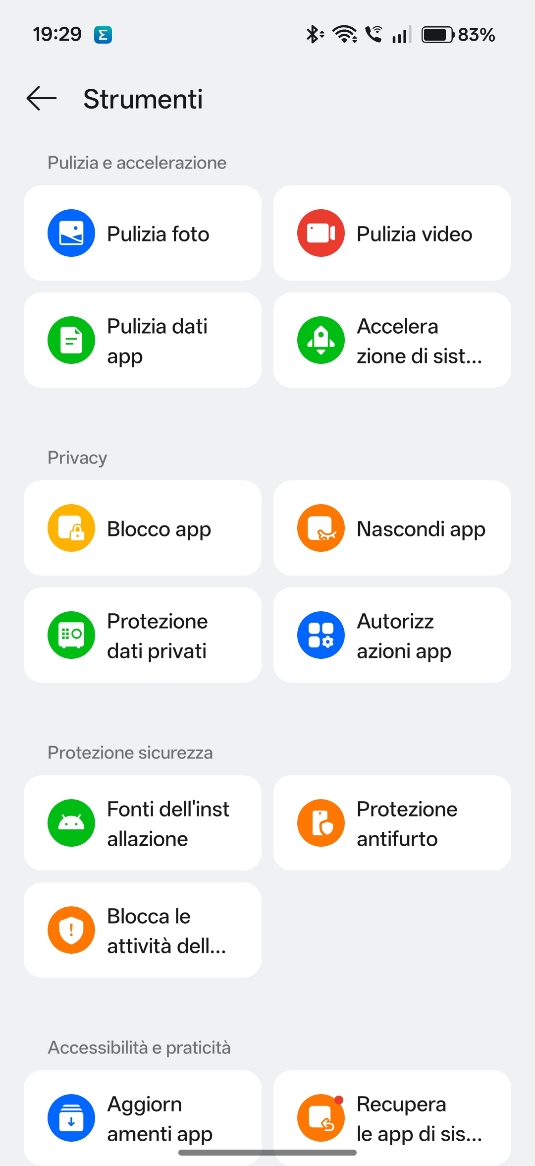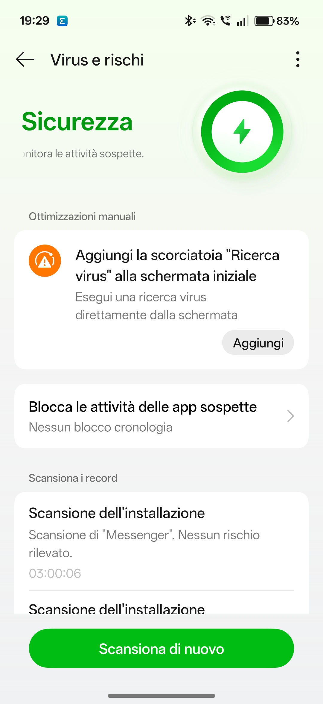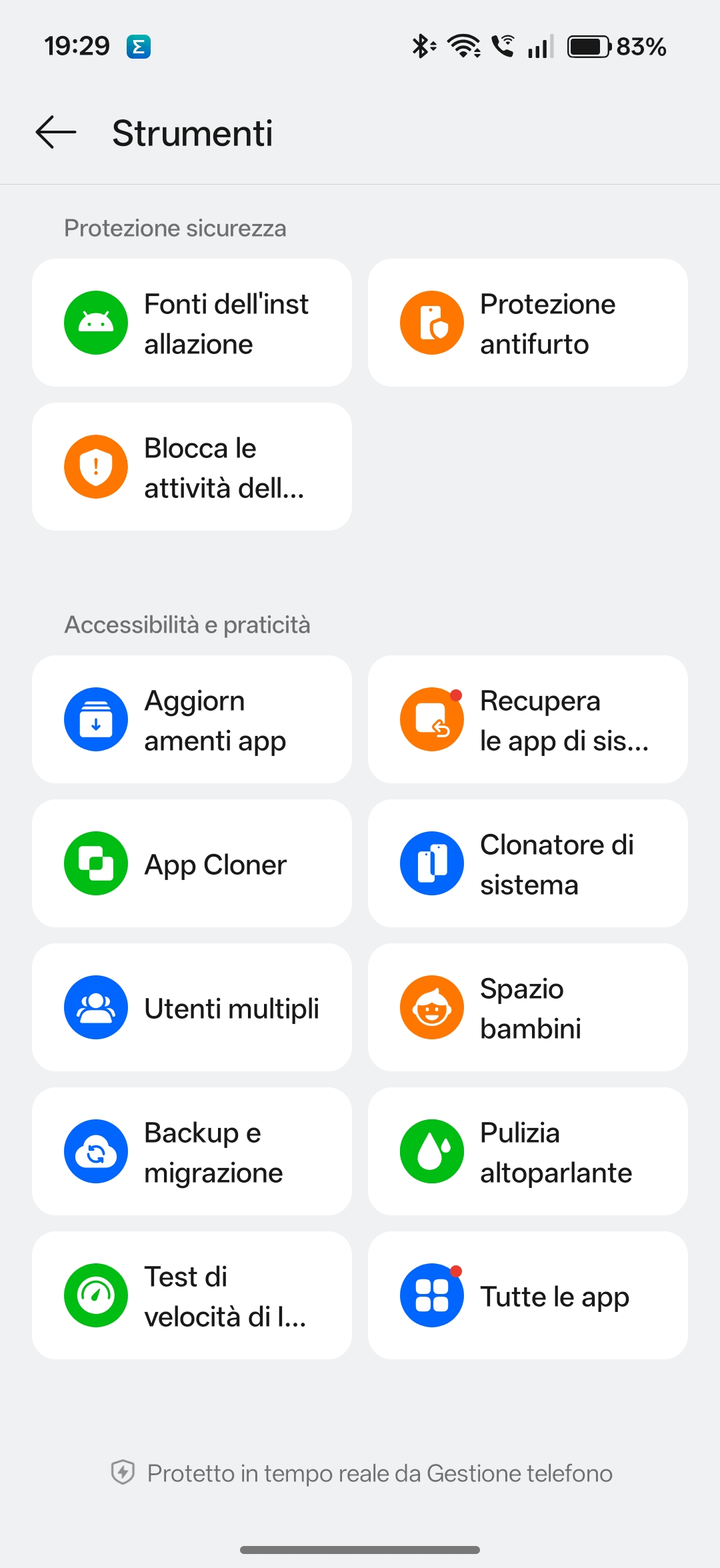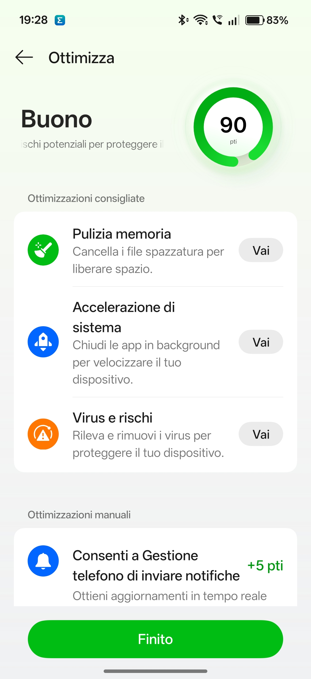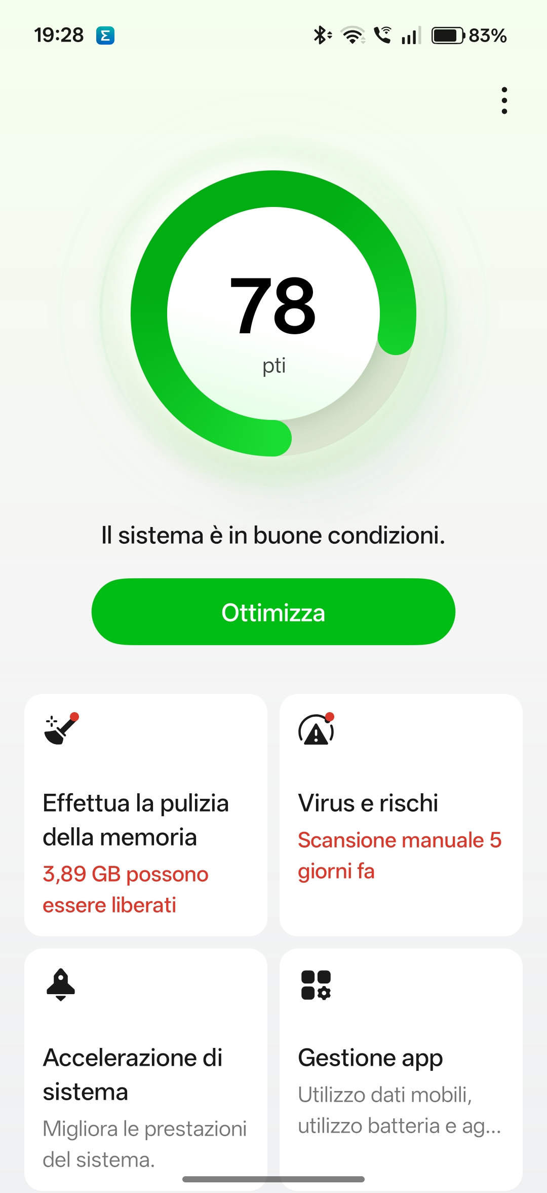 Tramite l’app Gestione Telefono è possibile, appunto, gestire il telefono effettuando varie operazioni, come per esempio ottimizzare il dispositivo, fare pulizia delle app che risiedono in memoria, vedere l’utilizzo dei dati, il filtro molestie, la durata della batteria ed effettuare la Scansione Virus.