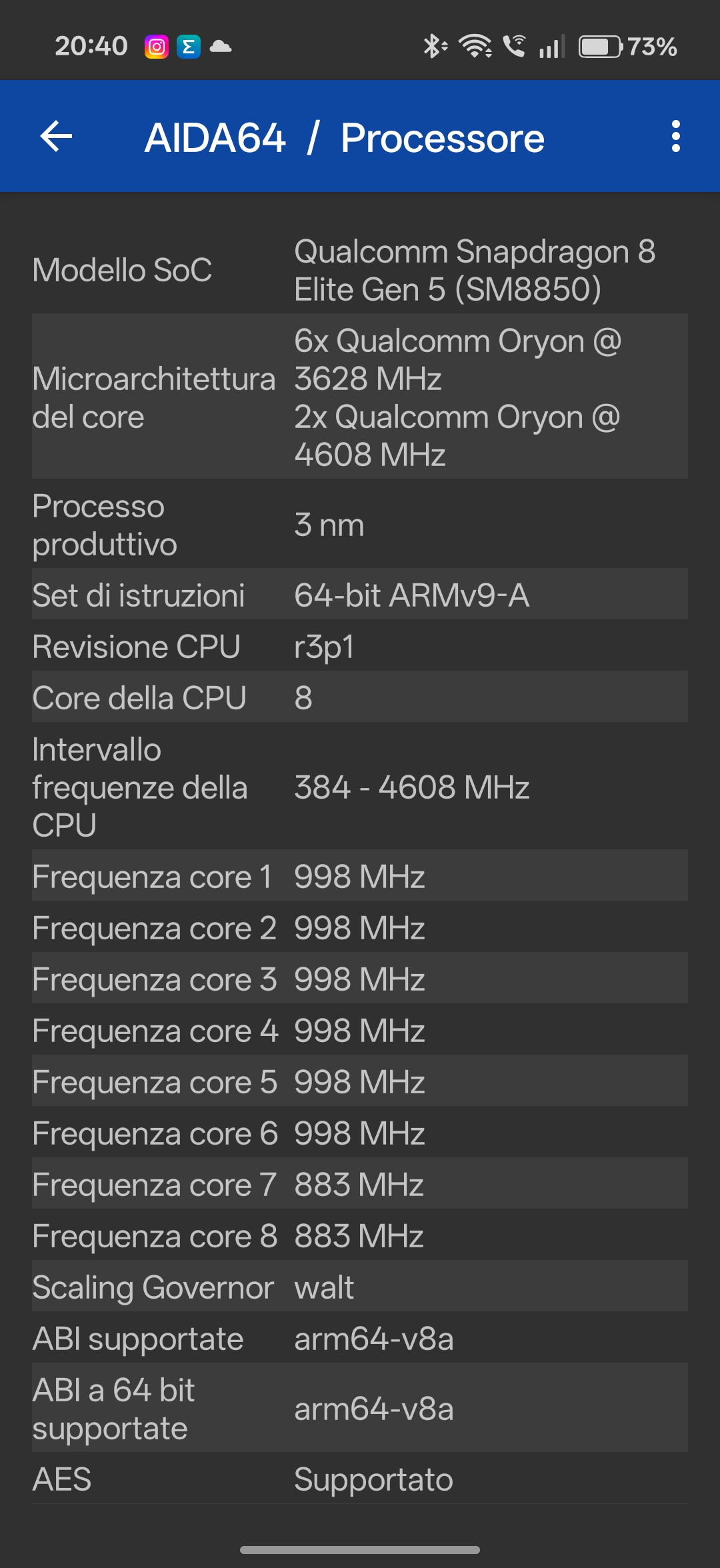 – Processore: Qualcomm SM8850-AC Snapdragon 8 Elite Gen 5 (3 nm) – Octa-core (2×4.6 GHz Oryon V3 Phoenix L + 6×3.62 GHz Oryon V3 Phoenix M)
