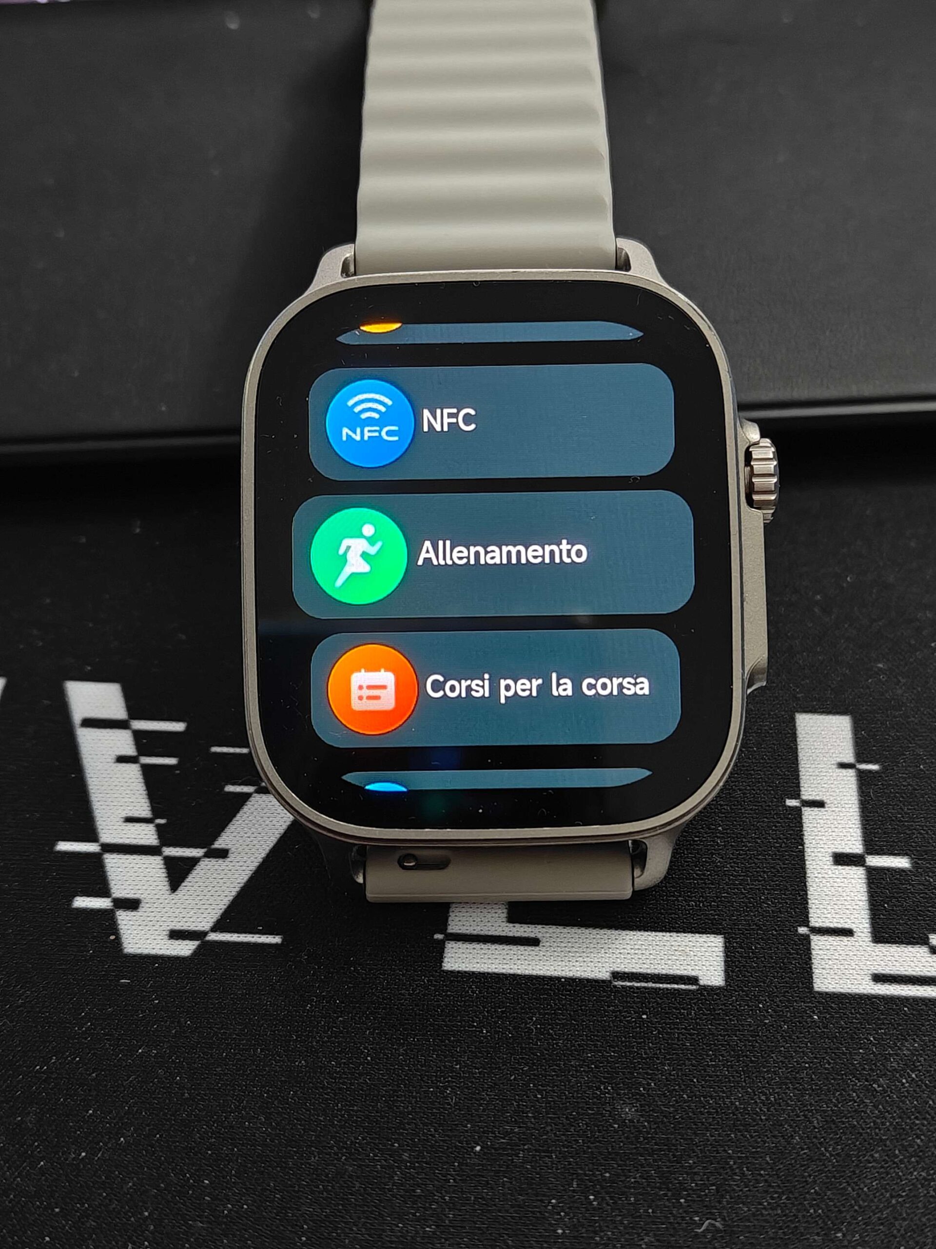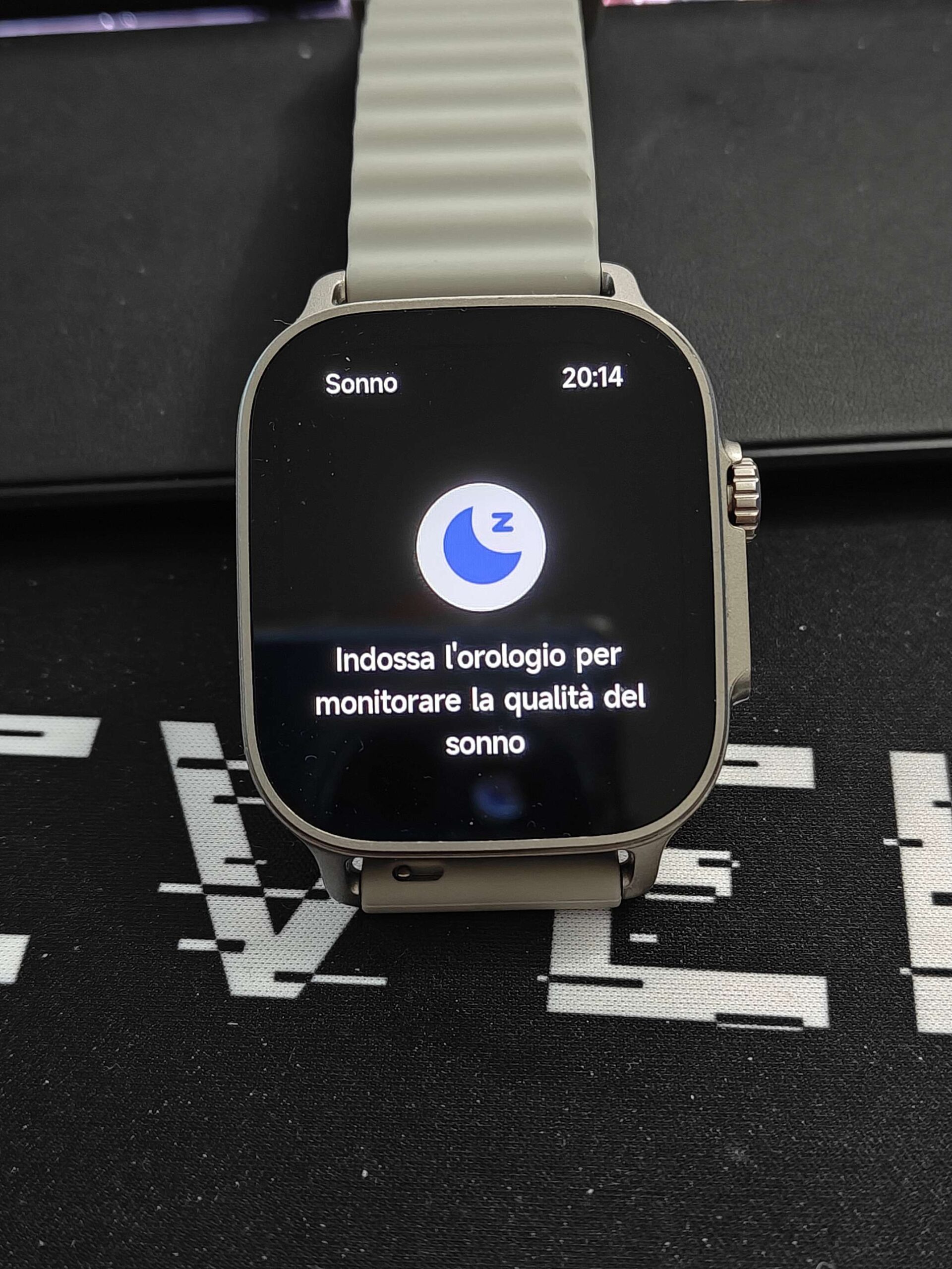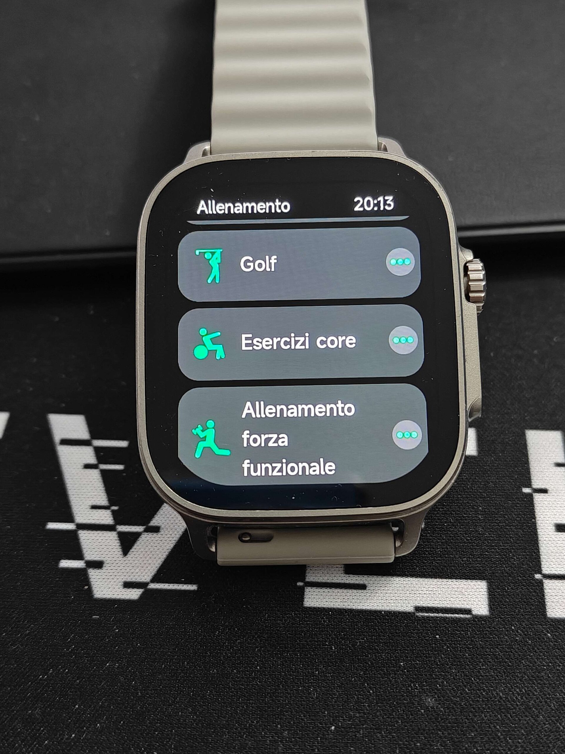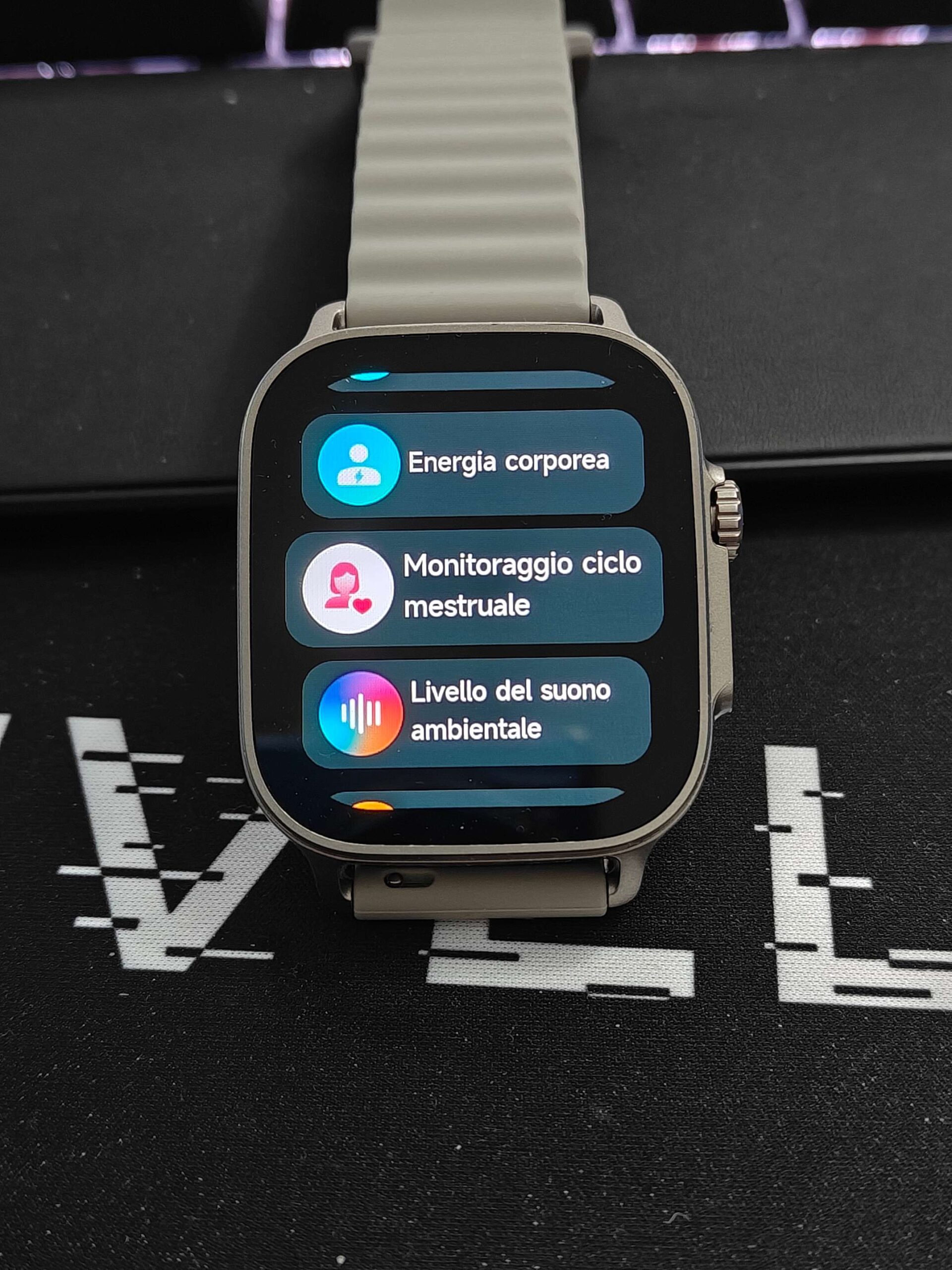 Il design adotta forme squadrate ma addolcite agli angoli, con una cassa dall’effetto metal‑look e una corona laterale in lega e linee pulite che si abbinano tanto a un contesto sportivo quanto a quello lavorativo. Al polso è leggero e non ingombrante, con una sensazione di solidità superiore rispetto alla sua fascia di appartenenza. Al polso è leggero e comodo per tutto il giorno; Il cinturino in silicone risulta morbido al tatto e traspirante, caratteristiche fondamentali per un dispositivo pensato per l’attività fisica, inoltre utilizza un sistema di sgancio rapido standard da 22 mm.