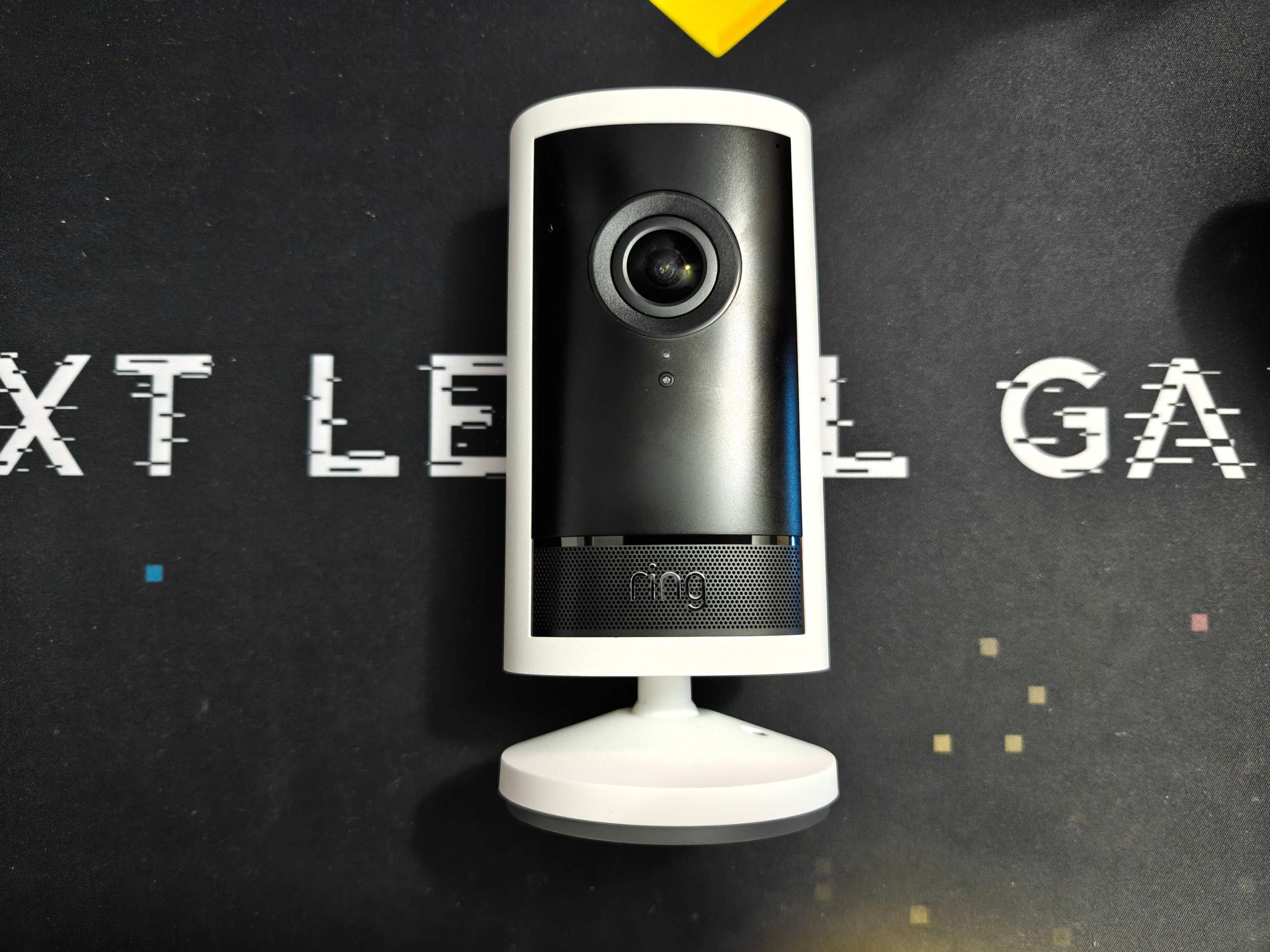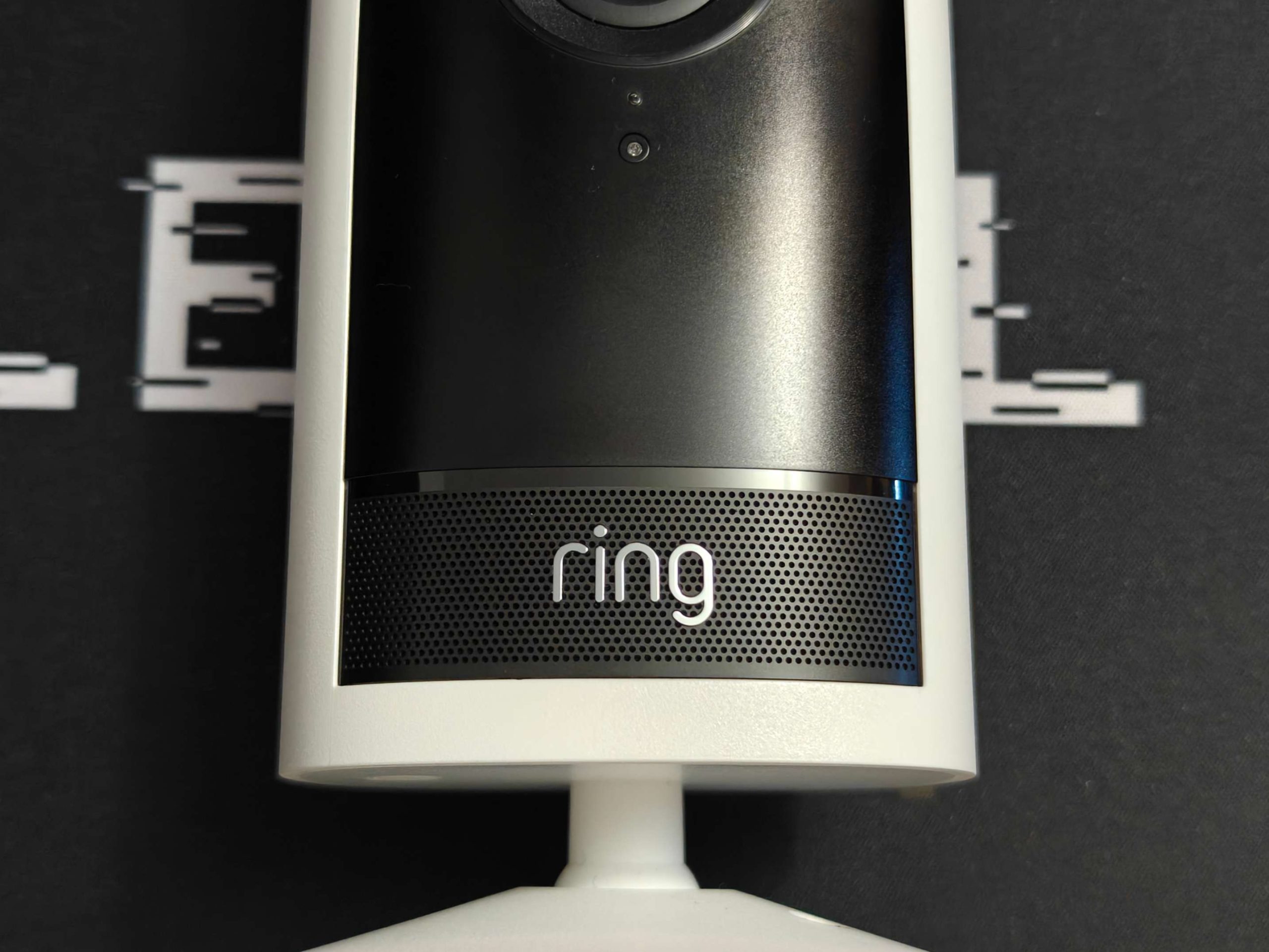 La Ring Outdoor Cam Pro è di forma cilindrica di plastica bianca, alta circa 14.5 centimetri, con un frontale nero che ospita obiettivo e sensori.