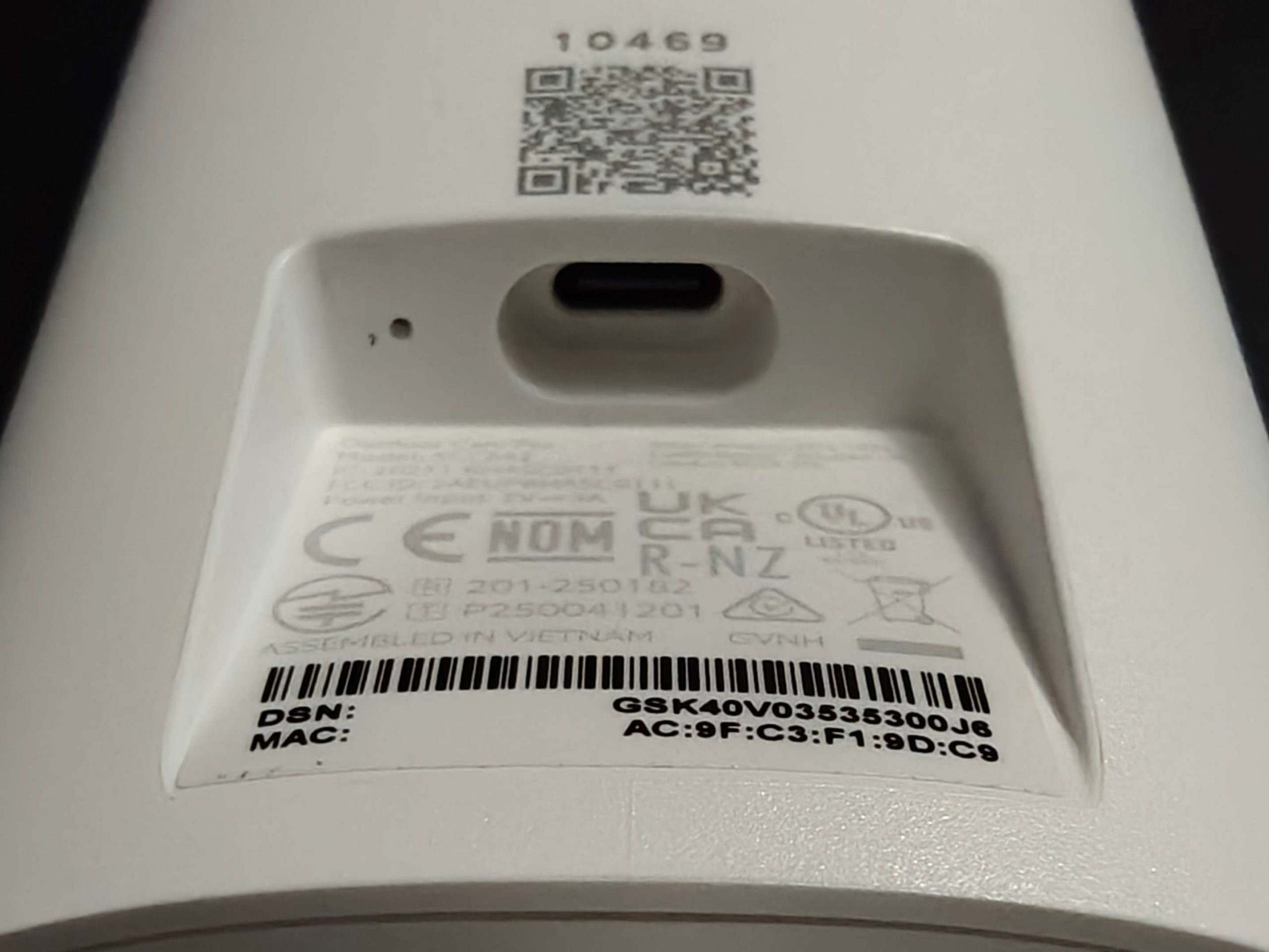 La base è un supporto circolare con uno snodo a sfera che permette di inclinare la telecamera in ogni direzione. Si può fissare sia a parete che a soffitto (o sotto una grondaia) usando le viti in dotazione. Una volta posizionata, si stringe la vite sottostante che blocca tutto il blocco, impedendo alla telecamera di spostarsi con il vento o le vibrazioni. Posteriormente si trova l’ingresso USB C per il cavo di alimentazione.