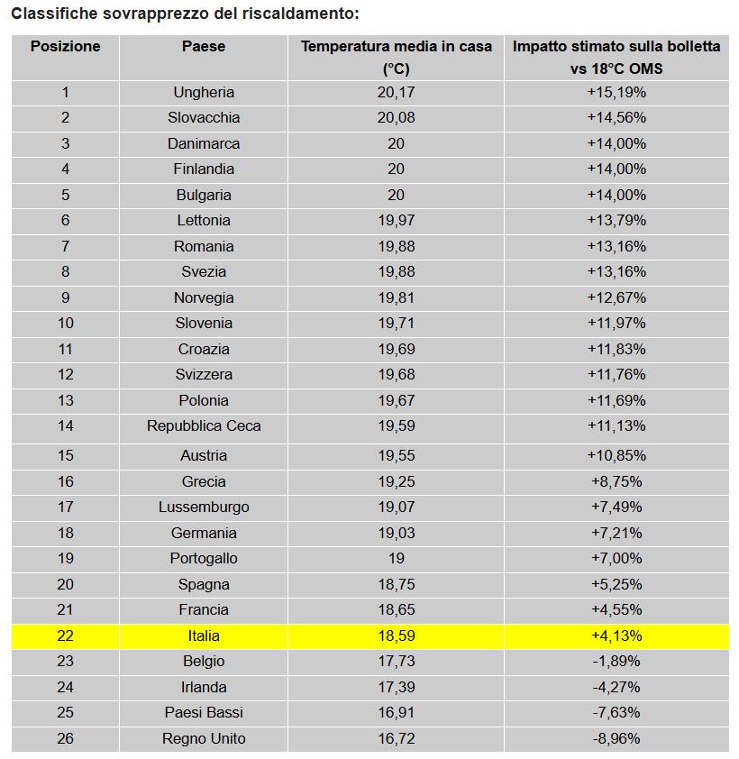 Allargando lo sguardo all’Europa, l’Europa settentrionale, centrale e orientale concentra molte delle case più calde: Paesi come Danimarca, Finlandia, Ungheria, Slovacchia e Bulgaria superano in media i 20°C, con un impatto stimato sulle bollette tra circa +12% e +15% rispetto ai 18°C. All’estremo opposto, Regno Unito, Paesi Bassi e Irlanda mantengono le case più fresche d’Europa, spesso sotto i 18°C, e per questo risparmiano fino a quasi il 9% sui costi di riscaldamento ogni anno.