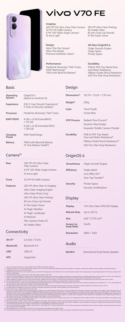 Pensato per un pubblico giovane, dinamico e attento allo stile, vivo V70 FE combina un design raffinato con funzionalità avanzate per la creazione di contenuti.