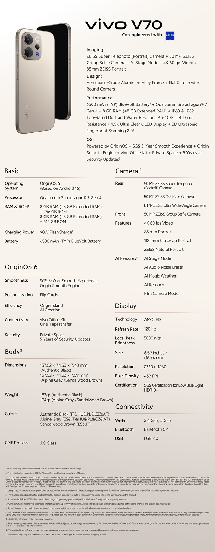 «La serie V70 offre un’esperienza di utilizzo migliore grazie a un design ancora più accattivante, una fotografia di qualità superiore e prestazioni complessivamente ottimizzate», ha dichiarato Yong Dao, General Manager di vivo Italia. «Grazie a un design raffinato e resistente, al nuovo OriginOS ancora più fluido e intelligente e a un sistema fotografico di livello professionale, con la serie V70 offriamo agli utenti dispositivi eleganti e affidabili in qualsiasi scenario».
